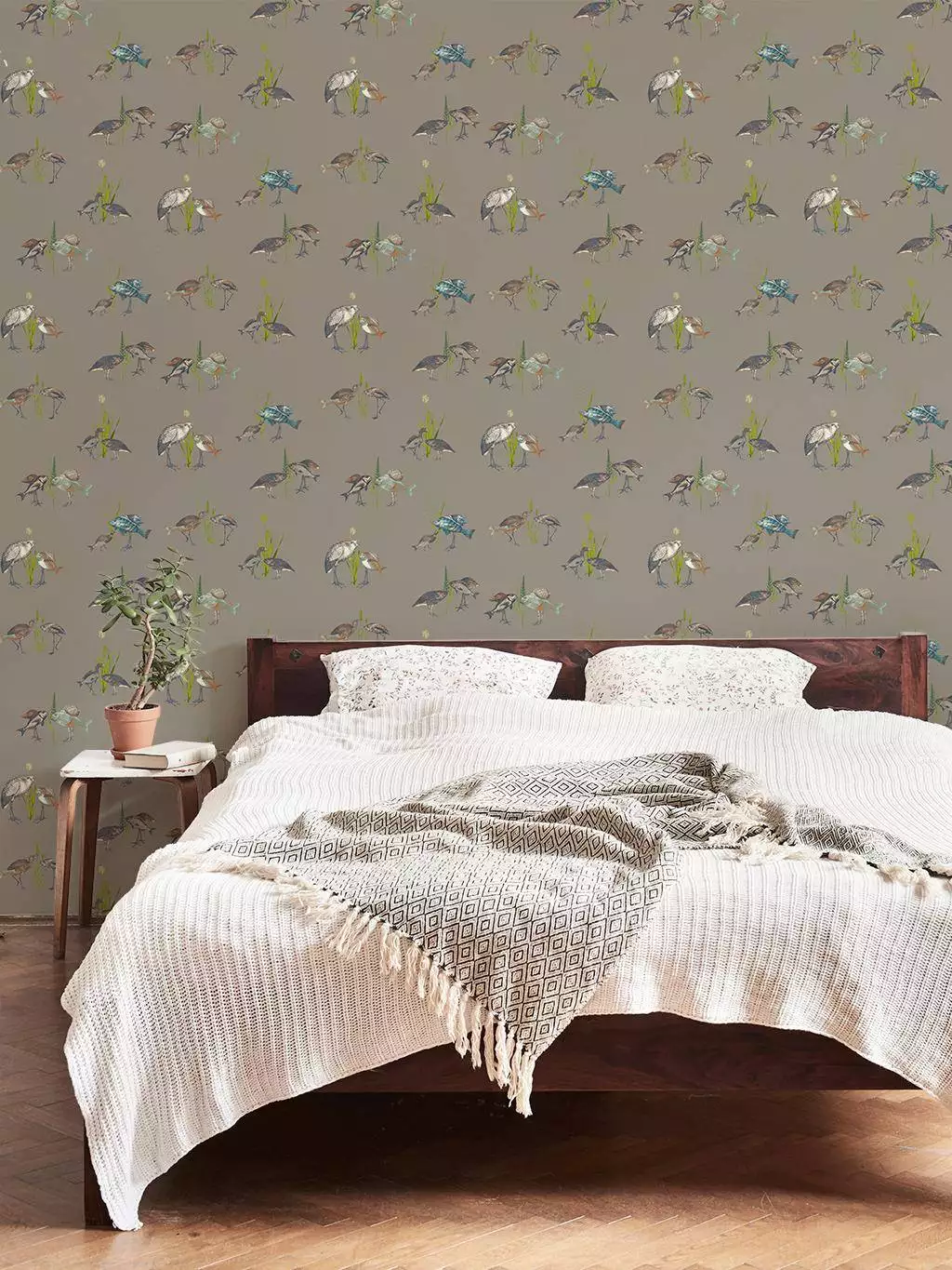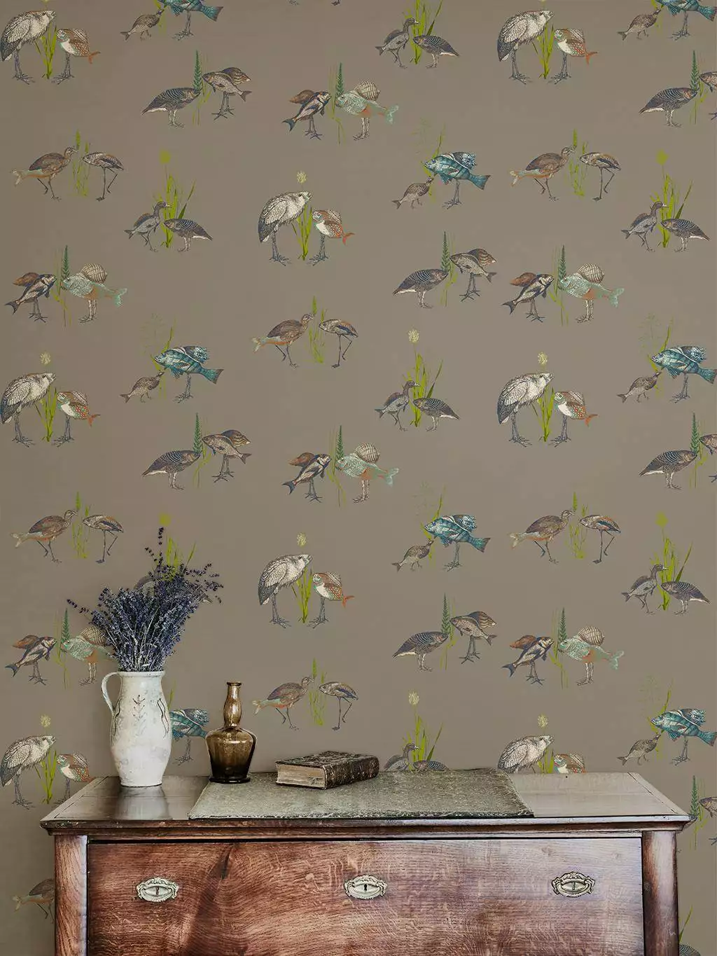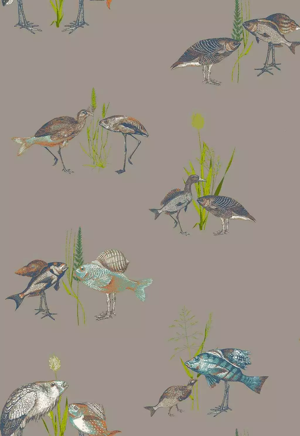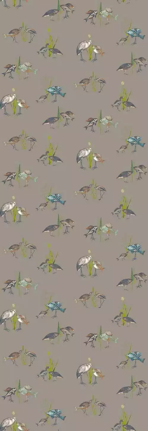 Eine Tapete voller leiser Poesie und verspielter Fantasie: Hier begegnen sich Vögel und Fische in einer surrealen, federleichten Szenerie. Die filigranen Illustrationen verweben Ornithologie und Unterwasserwelt zu einem augenzwinkernden Naturmärchen. Die gedeckte, taupefarbene Grundfläche schafft Ruhe, während die detailreichen Motive in Blau, Grün und Rosttönen kleine Entdeckungsmomente bereithalten. Ein ideales Wandbild für Räume, die von einer humorvollen, künstlerischen Note leben. In den Raumbildern sind ggf. mehrere Motive abgebildet.