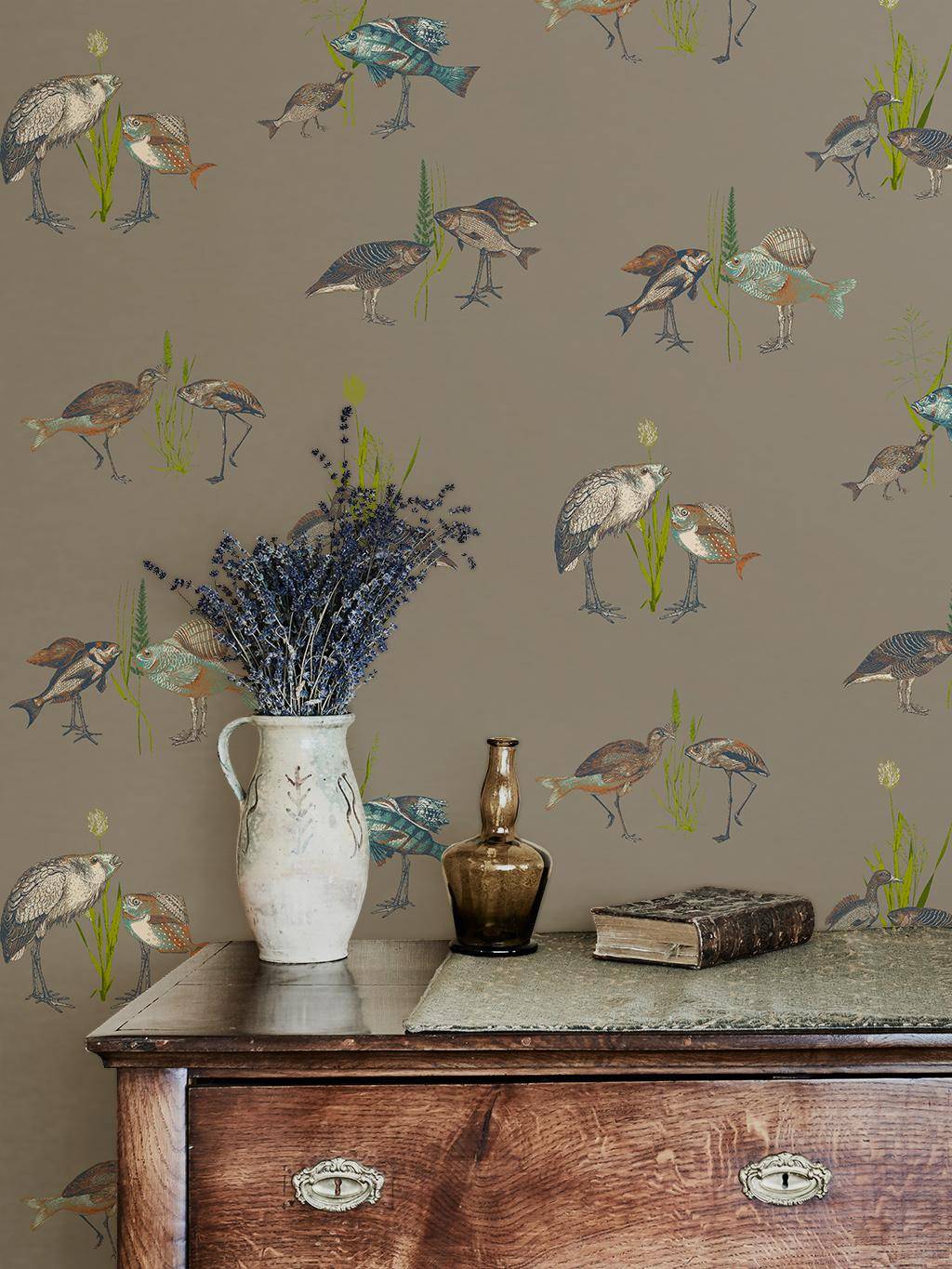 Eine Tapete voller leiser Poesie und verspielter Fantasie: Hier begegnen sich Vögel und Fische in einer surrealen, federleichten Szenerie. Die filigranen Illustrationen verweben Ornithologie und Unterwasserwelt zu einem augenzwinkernden Naturmärchen. Die gedeckte, taupefarbene Grundfläche schafft Ruhe, während die detailreichen Motive in Blau, Grün und Rosttönen kleine Entdeckungsmomente bereithalten. Ein ideales Wandbild für Räume, die von einer humorvollen, künstlerischen Note leben. In den Raumbildern sind ggf. mehrere Motive abgebildet.