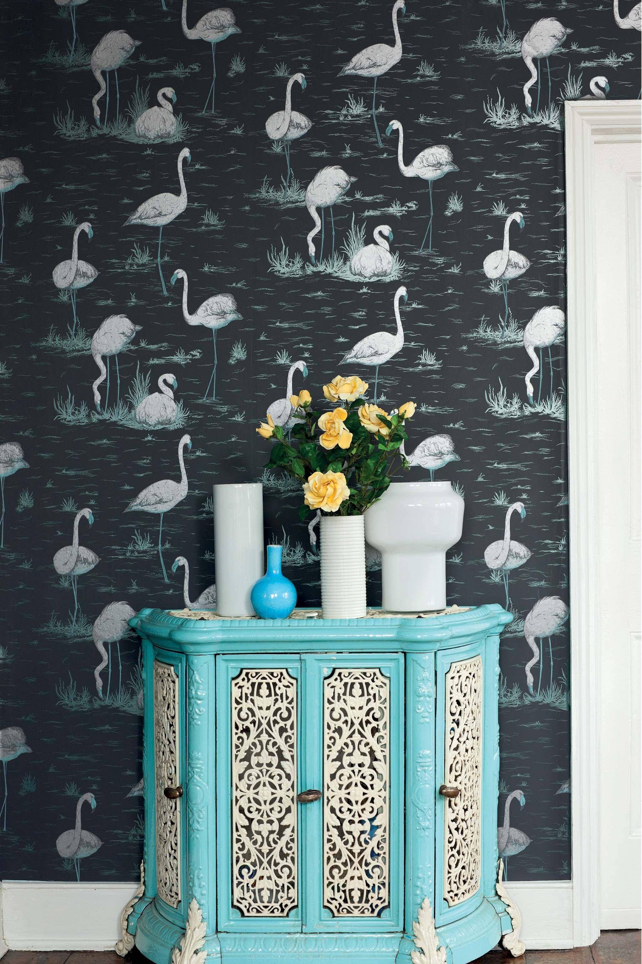 Langbeinig und graziös durchwandern stolze Flamingos auf dieser exotischen Tapete ihr nächtliches Terrain. Elegant beleben sie unsere Wohnzimmer und Essküchen. Das Motiv Flamingos ist nach wie vor eines der beliebtesten Designs von Cole & Son, mit seiner charmanten Wiederholung von lässigen Vögeln und subtilem Laub im Hintergrund. Die Farbgebung Metallic Silver & Teal on Charcoal bringt einen schönen Schimmer mit sich.