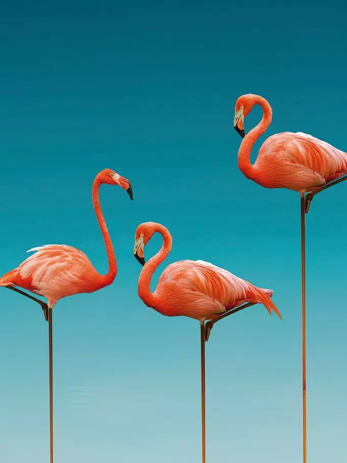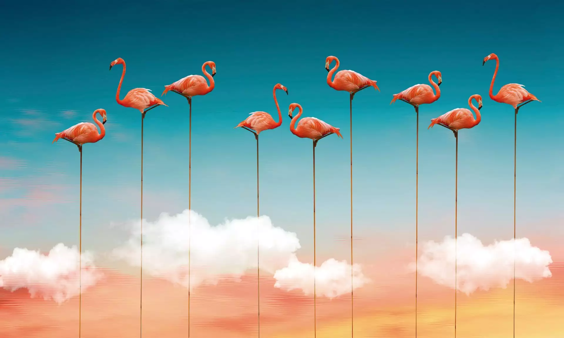 Die lebhaften Farben und die dynamische Komposition der Flamingos vor einem strahlend blauen Hintergrund verleihen Ihrem Raum ein Gefühl von Lebendigkeit und Freude. Diese Tapete ist nicht nur ein Blickfang, sondern auch eine Quelle der Inspiration und des Glücks.
