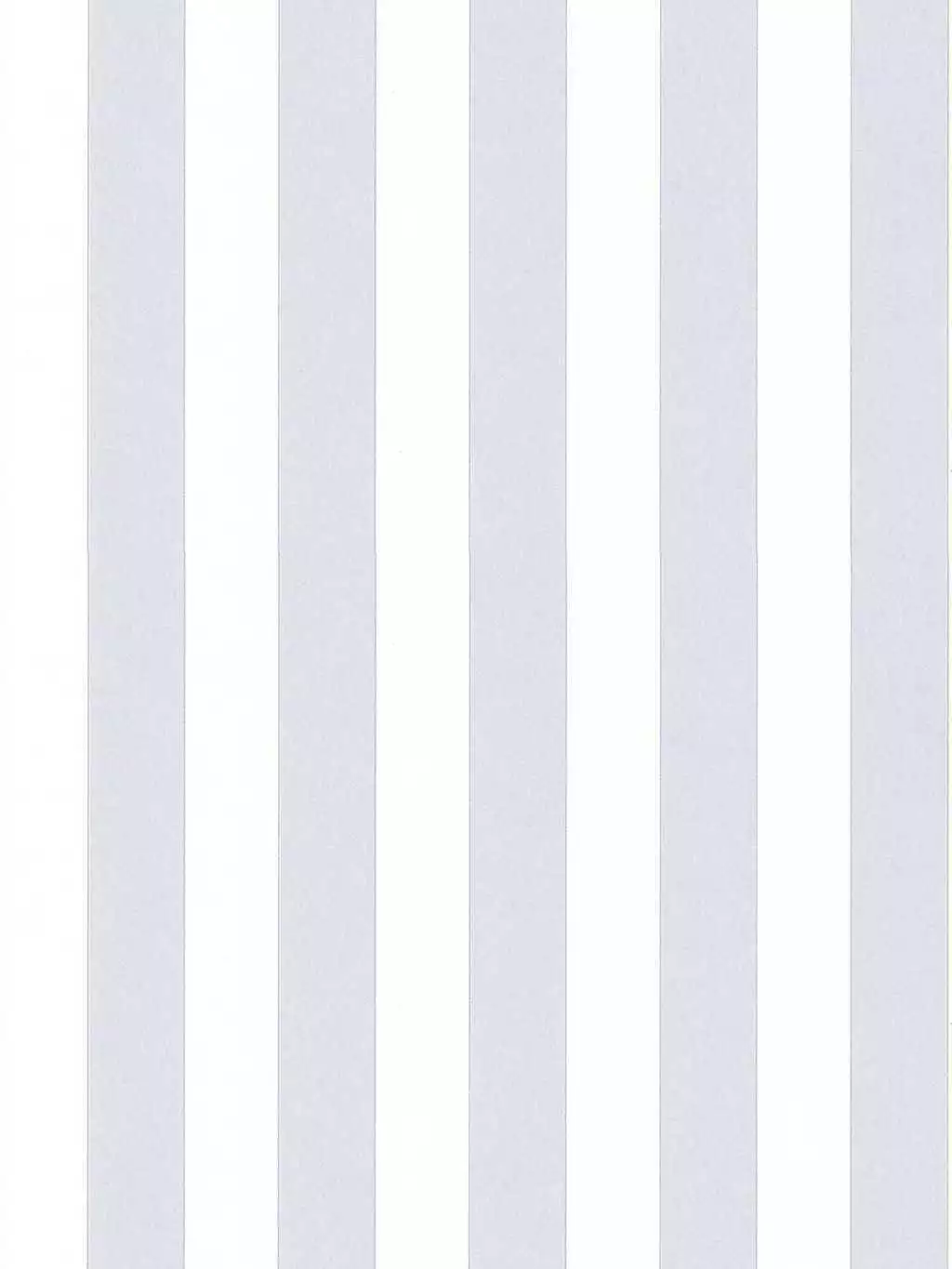 Die Tapete Florian, col. 11 zeigt einen klassischen Blockstreifen in hellem Beige und Hellblau, akzentuiert durch eine feine Silberlinie, die dem zeitlosen Streifendesign eine elegante Note verleiht. Die Züge sind zart und elegant und ihrer Geometrie sehr dekorativ.