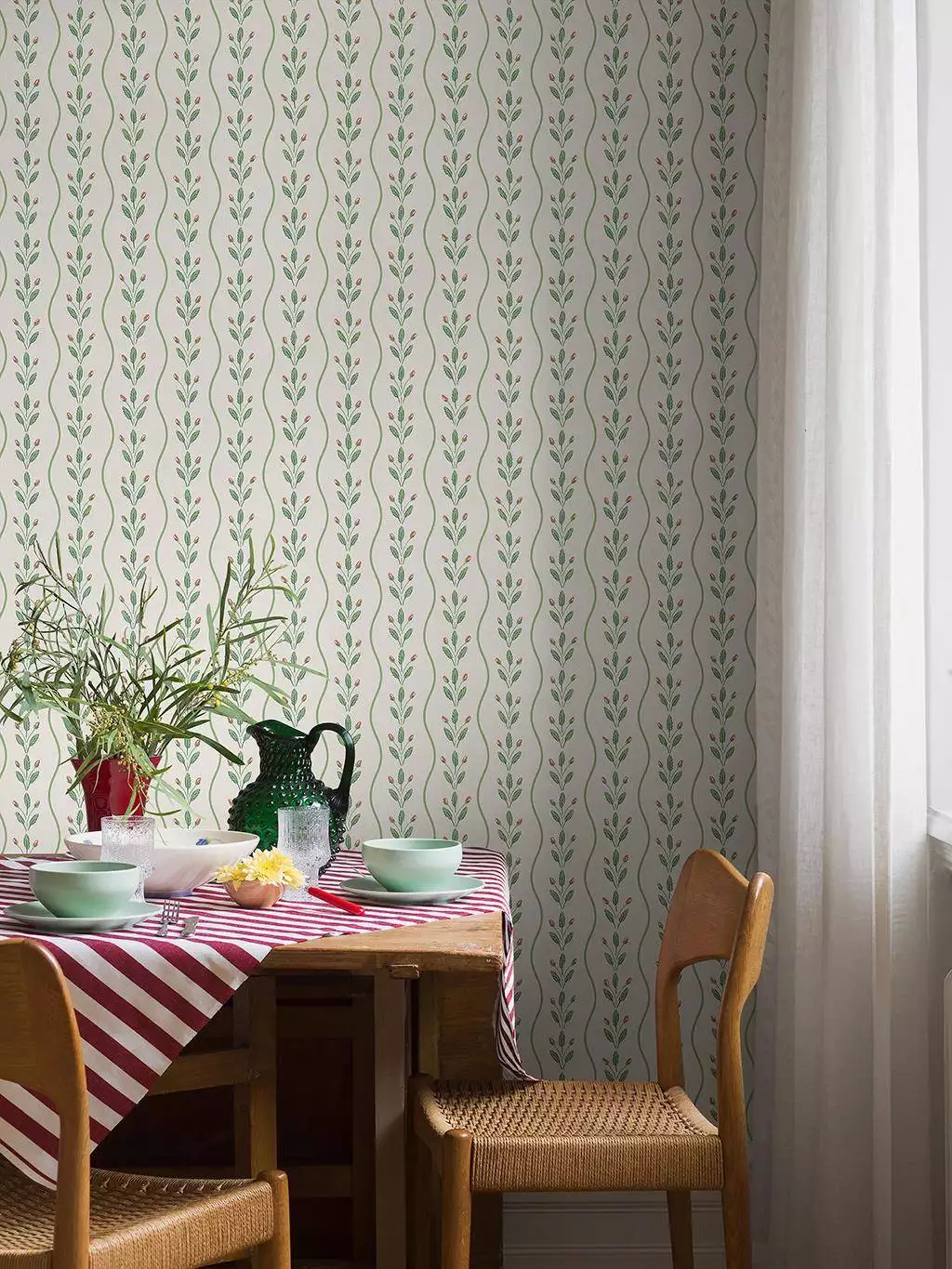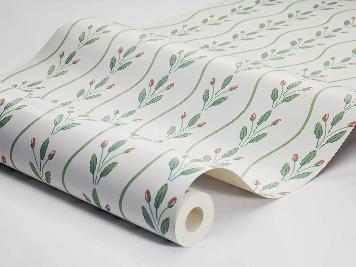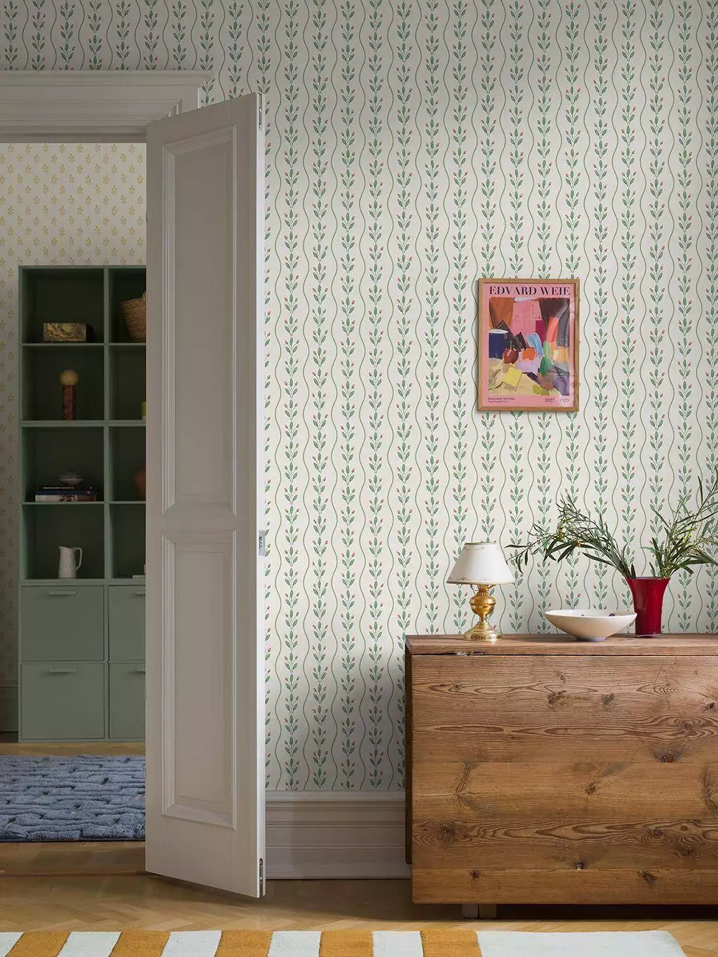 Streifen aus Blattranken und zarten Früchten wechseln sich mit schwungvollen Wellenlinien ab – leicht, freundlich, modern-klassisch. In Grün mit mittelblauen Akzenten und sanft roten Tupfen auf warmweißem Grund bringt Flower Buds spielerische Eleganz und Helligkeit an die Wand und passt vom skandinavischen Landhaus bis zum reduzierten Interieur.