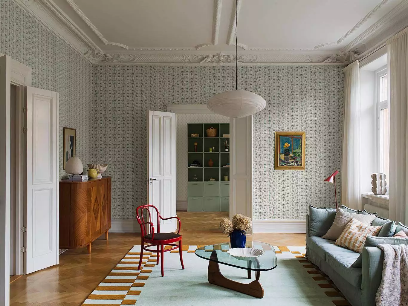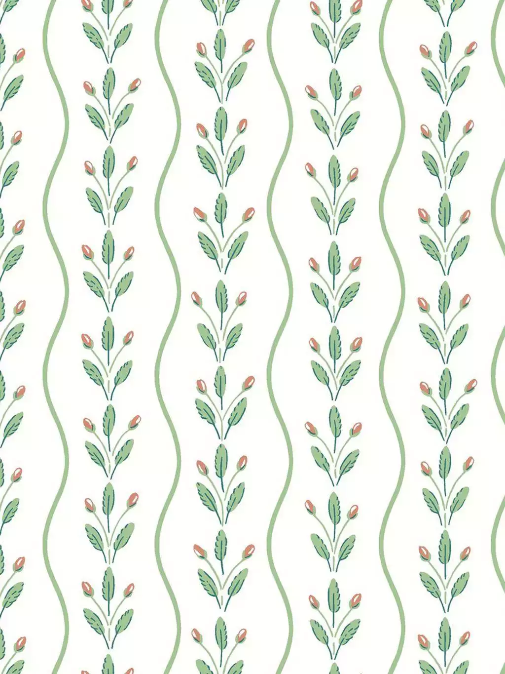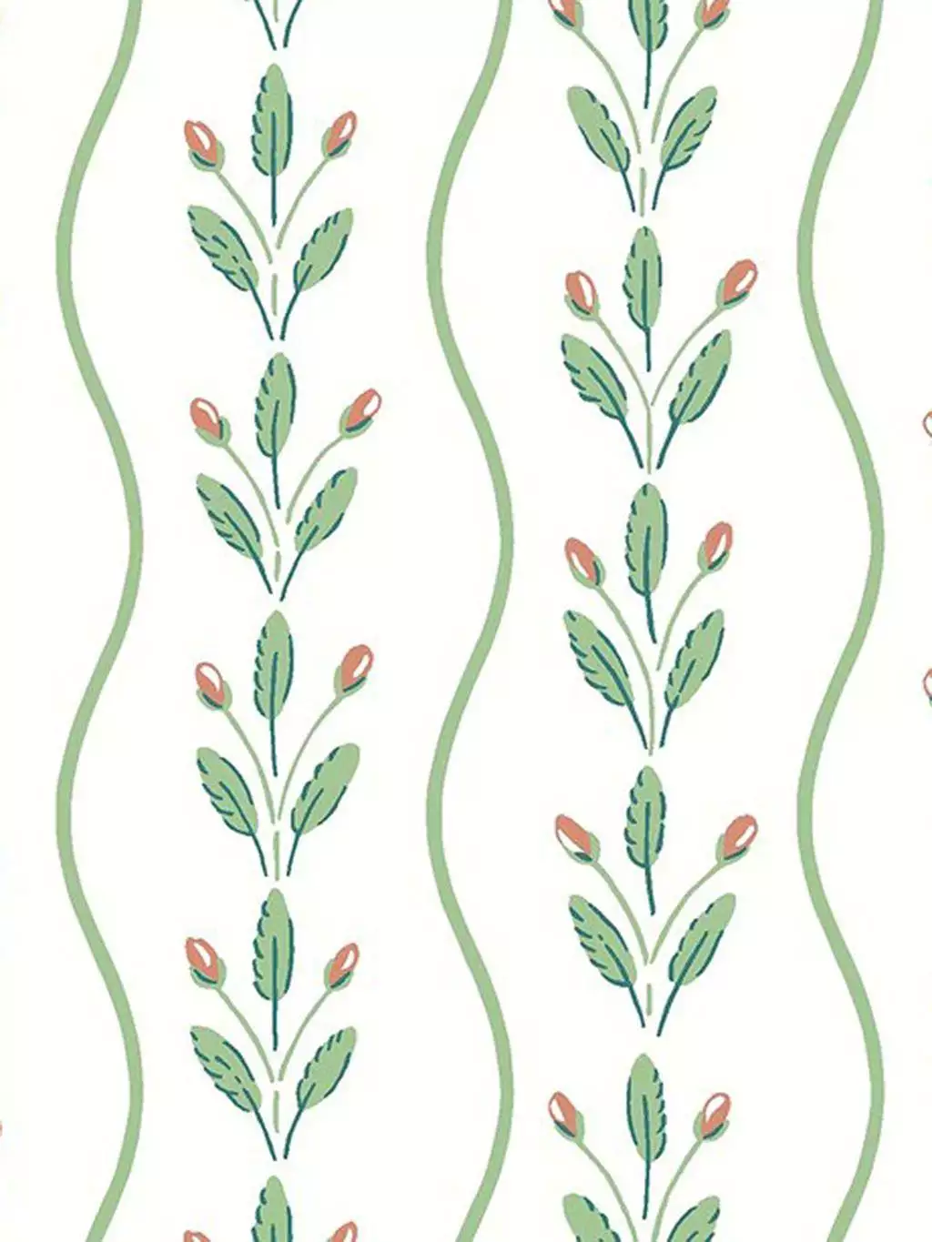 Streifen aus Blattranken und zarten Früchten wechseln sich mit schwungvollen Wellenlinien ab – leicht, freundlich, modern-klassisch. In Grün mit mittelblauen Akzenten und sanft roten Tupfen auf warmweißem Grund bringt Flower Buds spielerische Eleganz und Helligkeit an die Wand und passt vom skandinavischen Landhaus bis zum reduzierten Interieur.