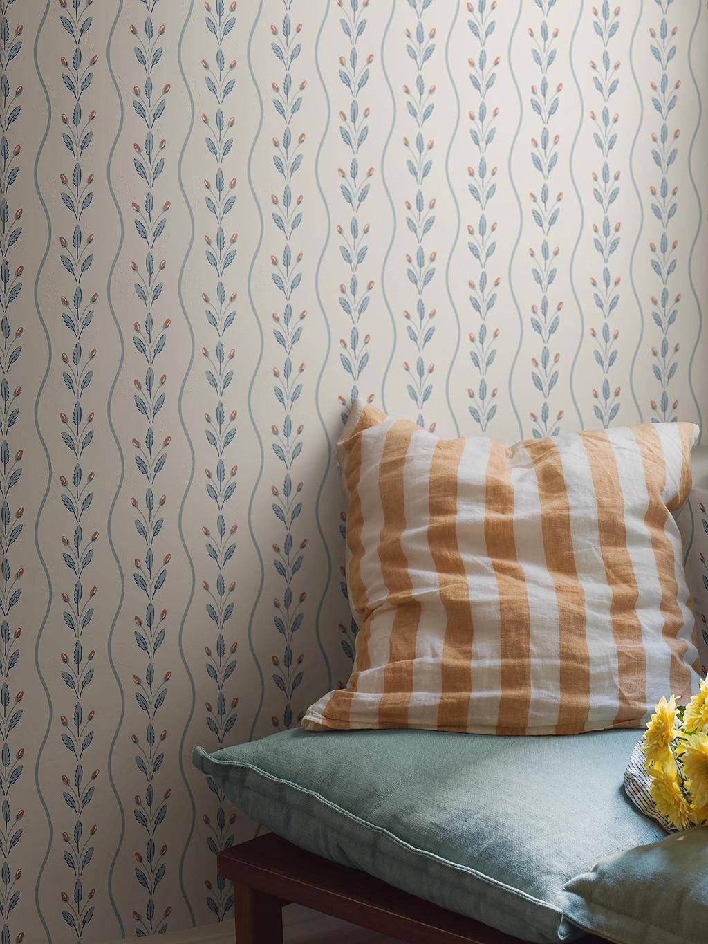 Bei der Tapete Flower Buds Streifen aus blauen Blattranken und zarten Früchten wechseln sich mit schwungvollen Wellenlinien ab – leicht, freundlich, modern-klassisch. In Blautönen mit sanft roten Akzenten auf warmweißem Grund bringt Flower Buds spielerische Eleganz und Helligkeit an die Wand und passt vom skandinavischen Landhaus bis zum reduzierten Interieur.