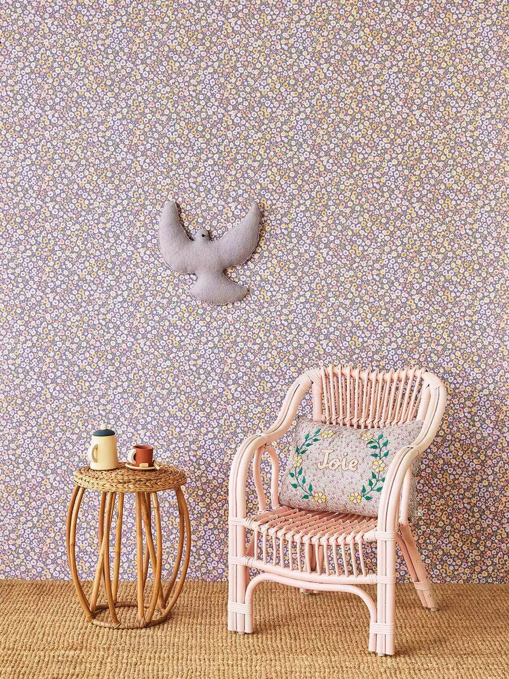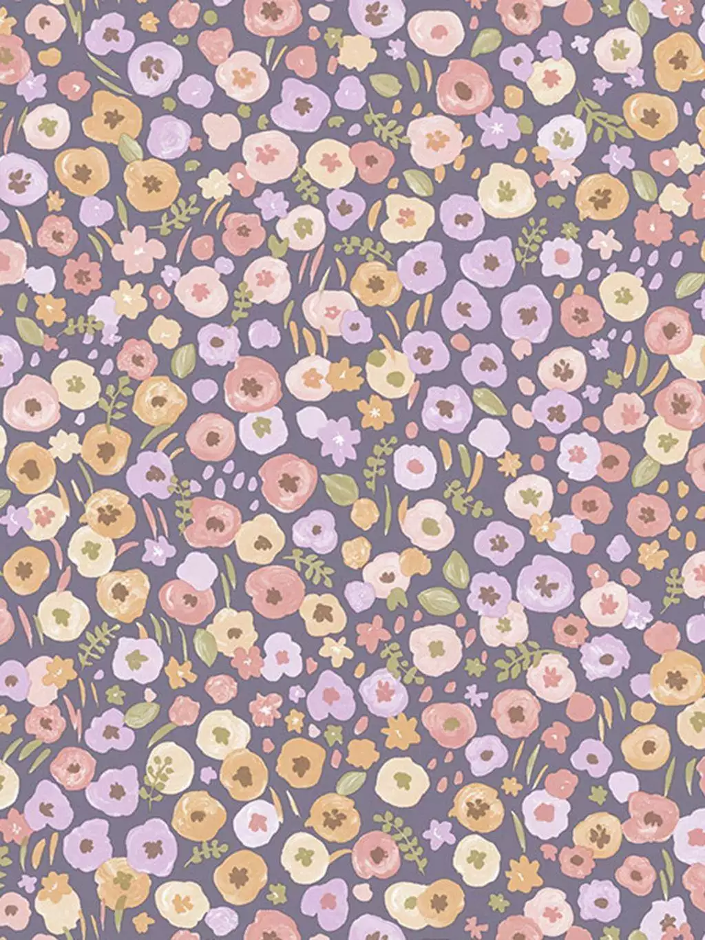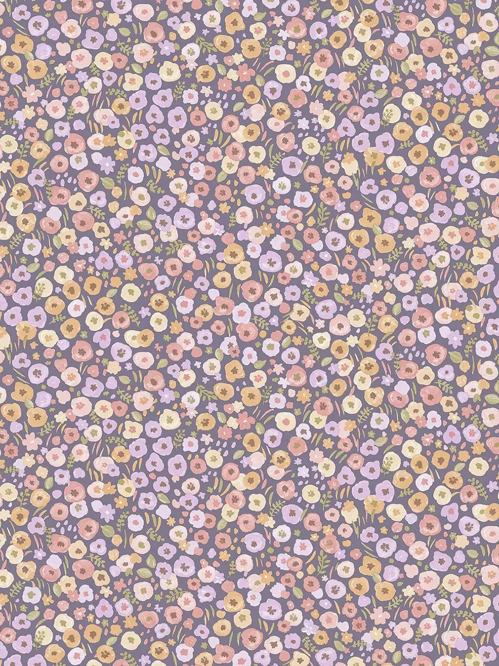 Die Flower Explore Tapete zeigt ein Muster aus winzigen Blümchen, die aus der Ferne wie kleine Pünktchen wirken. Es erschafft das Bild einer Blumenwiese in zarten Pastelltönen.