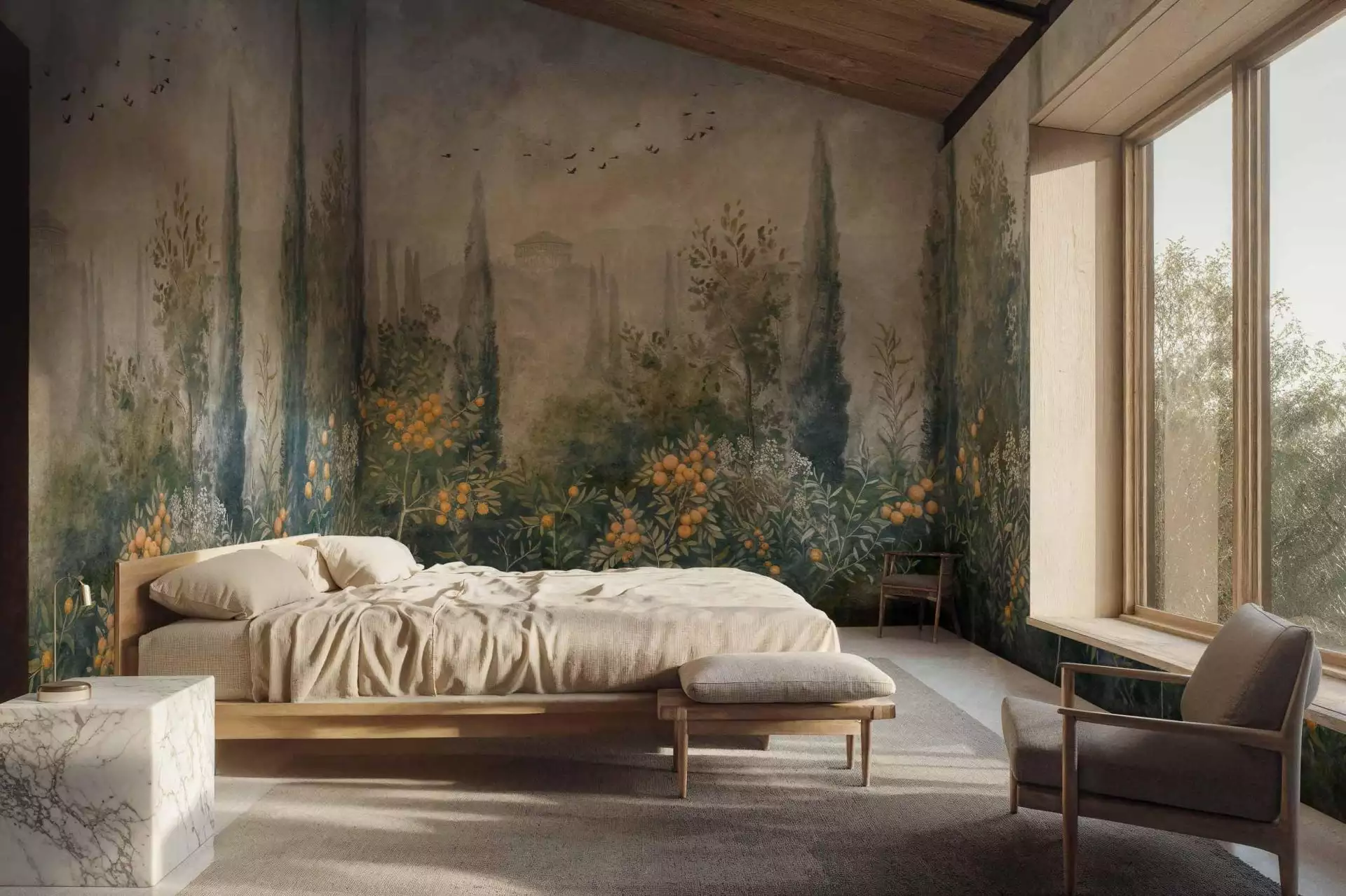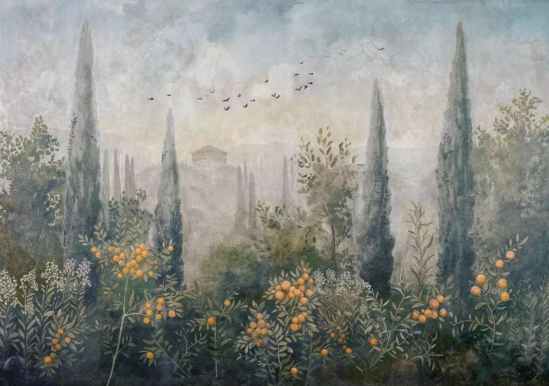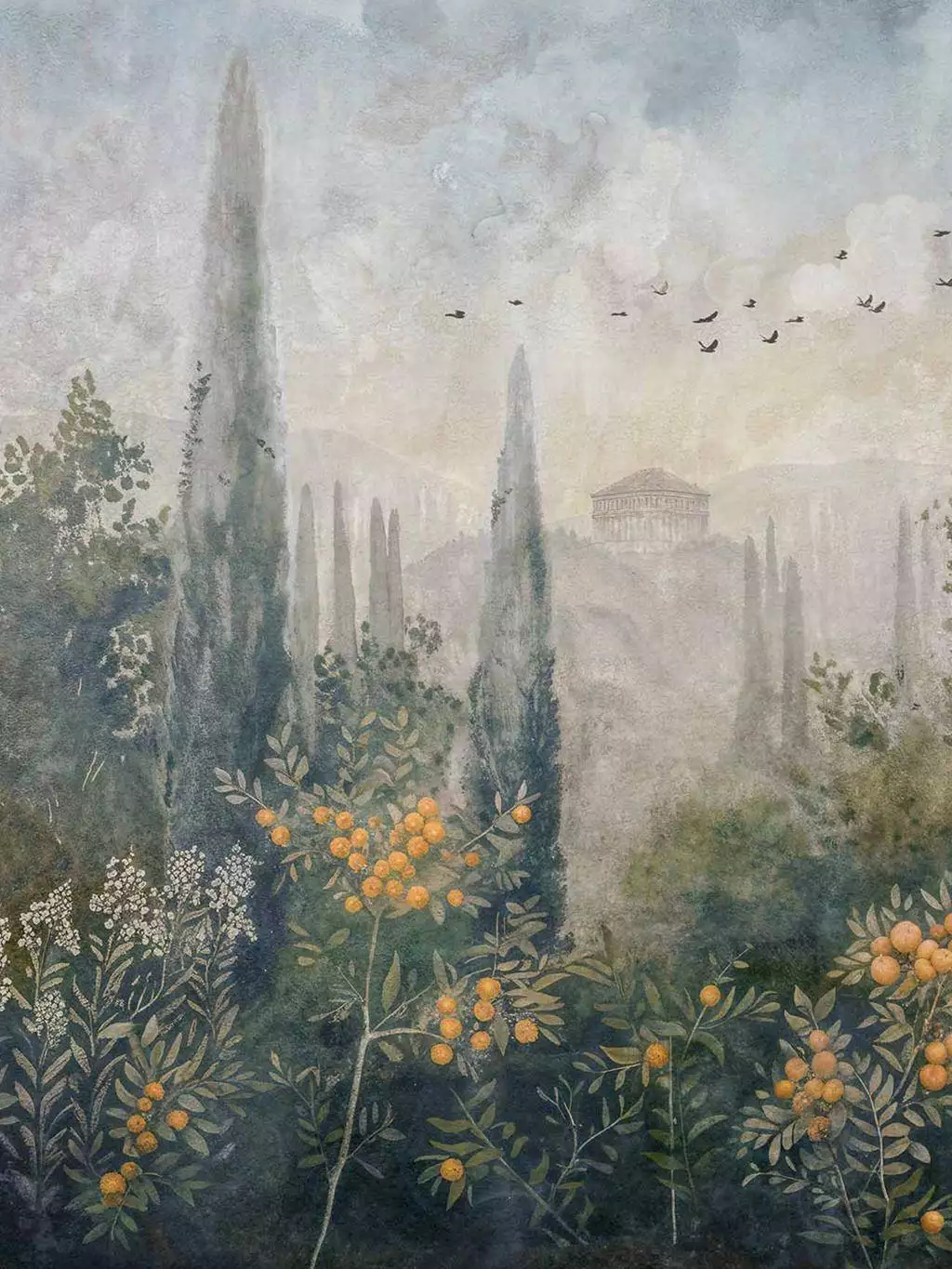 Klassische Ästhetik trifft auf moderne Raumgestaltung. Frutetto Winter von Coordonné ist eine hochwertige Vliestapete mit einem detailreichen Landschaftsmotiv in Blau- und Grüntönen. Zypressen, Granatapfel- und Orangenbäume sowie ziehende Vögel schaffen eine mediterrane Szenerie, die von antiken pompejanischen Wandmalereien inspoieriert ist. Das elegante Wandbild symbolisiert Fruchtbarkeit und Ruhe - eine edle Motivtapete für stilvolle Schlafzimmer, Wohnräume oder Hotels.