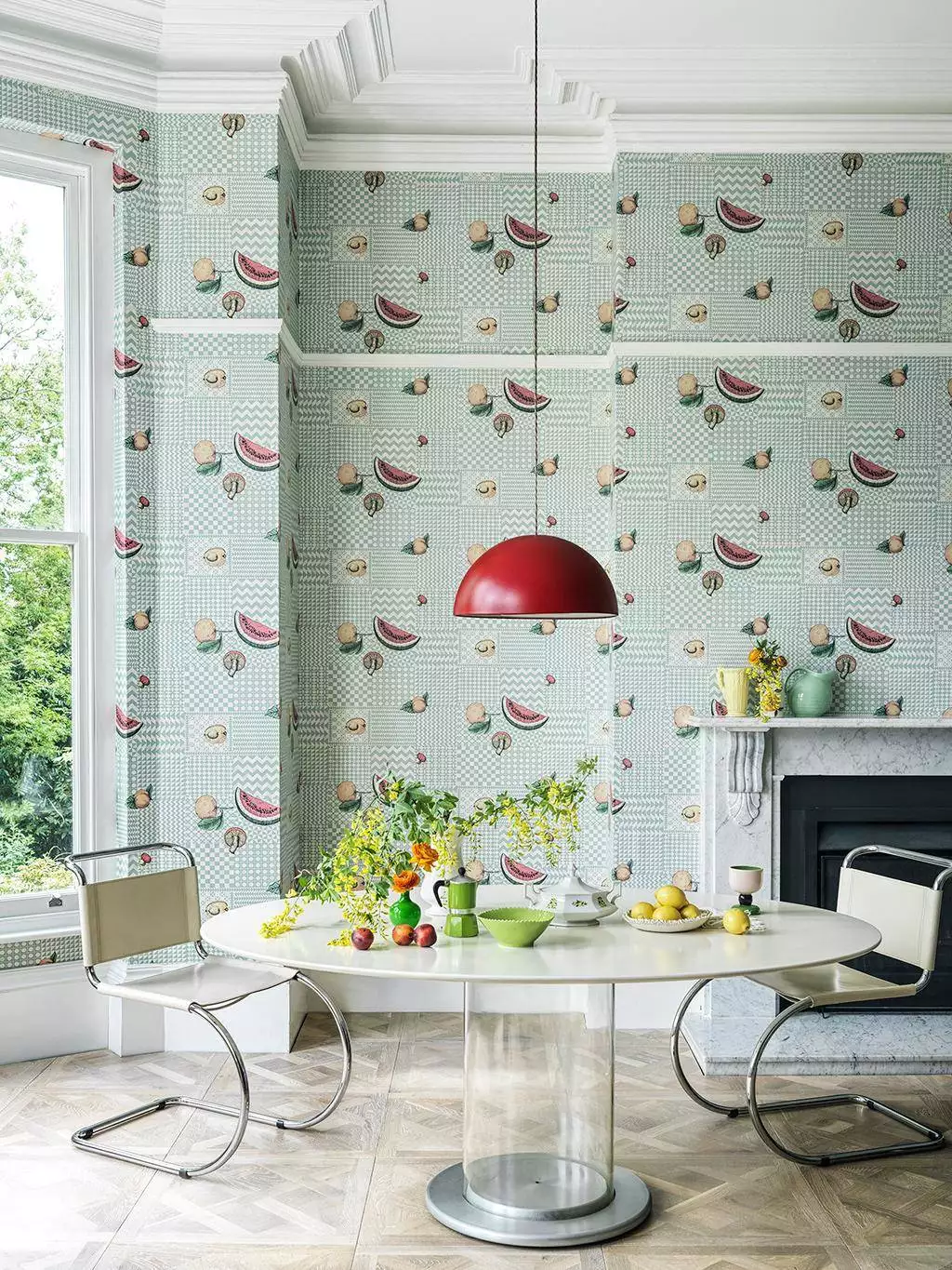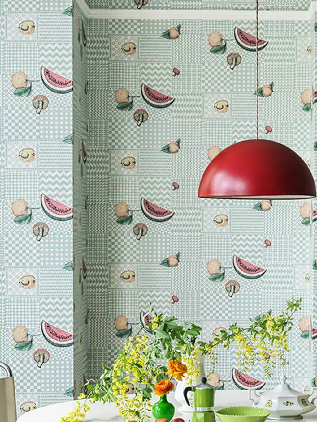 Die illustrative Streuung der Fruchtmotive auf der strukturierten Fläche erzeugt einen subtilen Trompe-l’œil-Effekt mit räumlicher Tiefe. Im Raum wirkt das Design frisch, lebendig und zugleich geordnet – ideal für offene Wohnküchen, Esszimmer oder kreative Arbeitsbereiche mit lockerer Atmosphäre und gestalterischer Klarheit.
