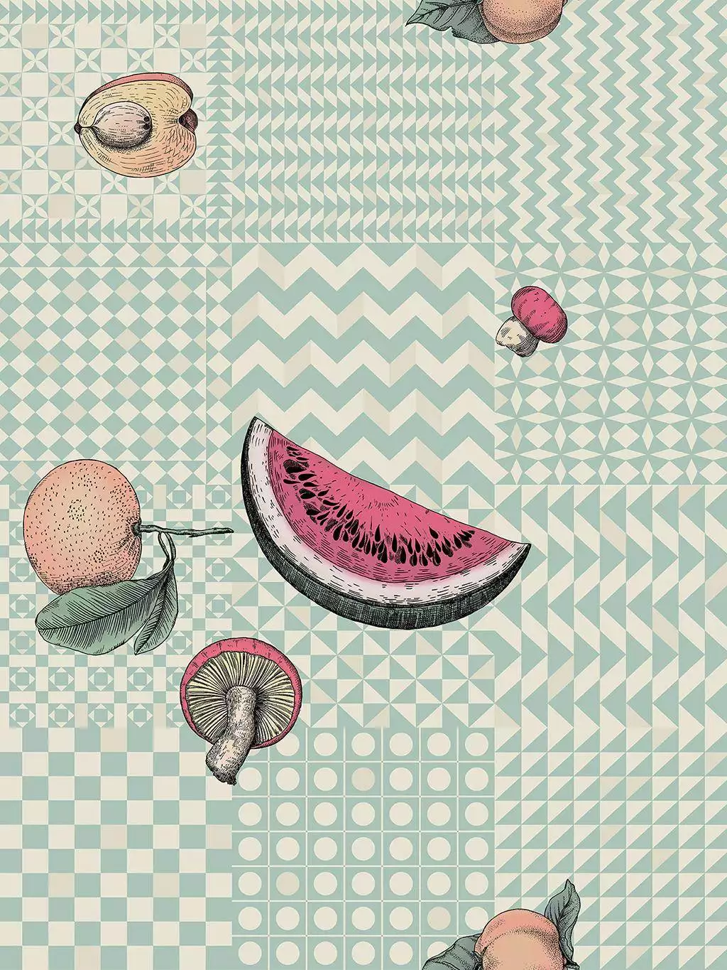 Profitieren Sie von zwei zentralen Gestaltungsideen aus dem Fornasetti-Kosmos in einem ausgewogenen Spannungsverhältnis: präzise Geometrie und naturalistische Darstellung. Das Motiv kombiniert grafische Muster – von Zickzack über Schachbrett bis zu Kreisrastern – mit fein gezeichneten Früchten, Pilzen und Blättern. Die Farbgebung in sanften Mint- und Pastelltönen nimmt der Komposition Härte und verleiht ihr Leichtigkeit.