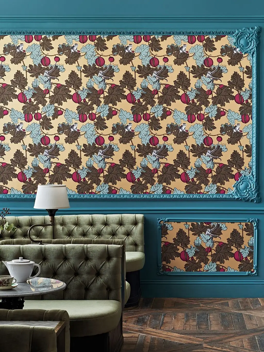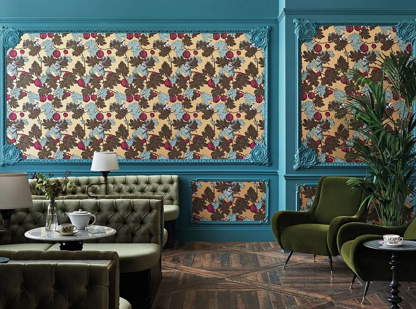 • Großformatige Muster, warme Farben und dezente Metallic-Effekte, die Tiefe und Eleganz schaffen