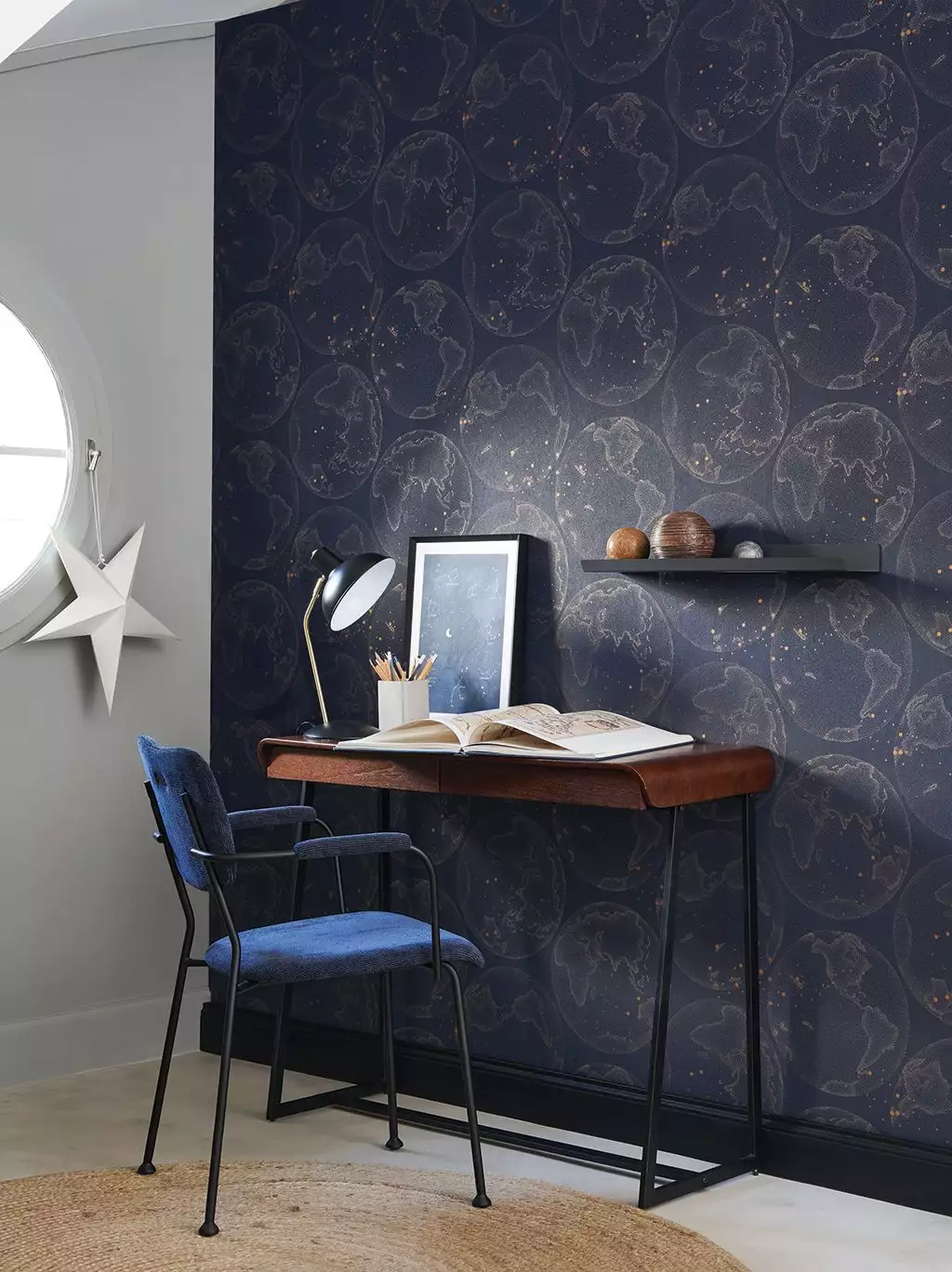 Die Tapete Gallee aus der Kollektion Voyage Onirique aus dem Hause Casadeco bringt sowohl Kinderaugen als auch die von Erwachsenen zum Leuchten. Das faszinierende Muster mit den schimmernden Weltkugeln auf sattem Mitternachtsblau entführt in die Weiten des Weltraums. Die hochwertige Vliestapete schimmert leicht und lädt zum Träumen ein.