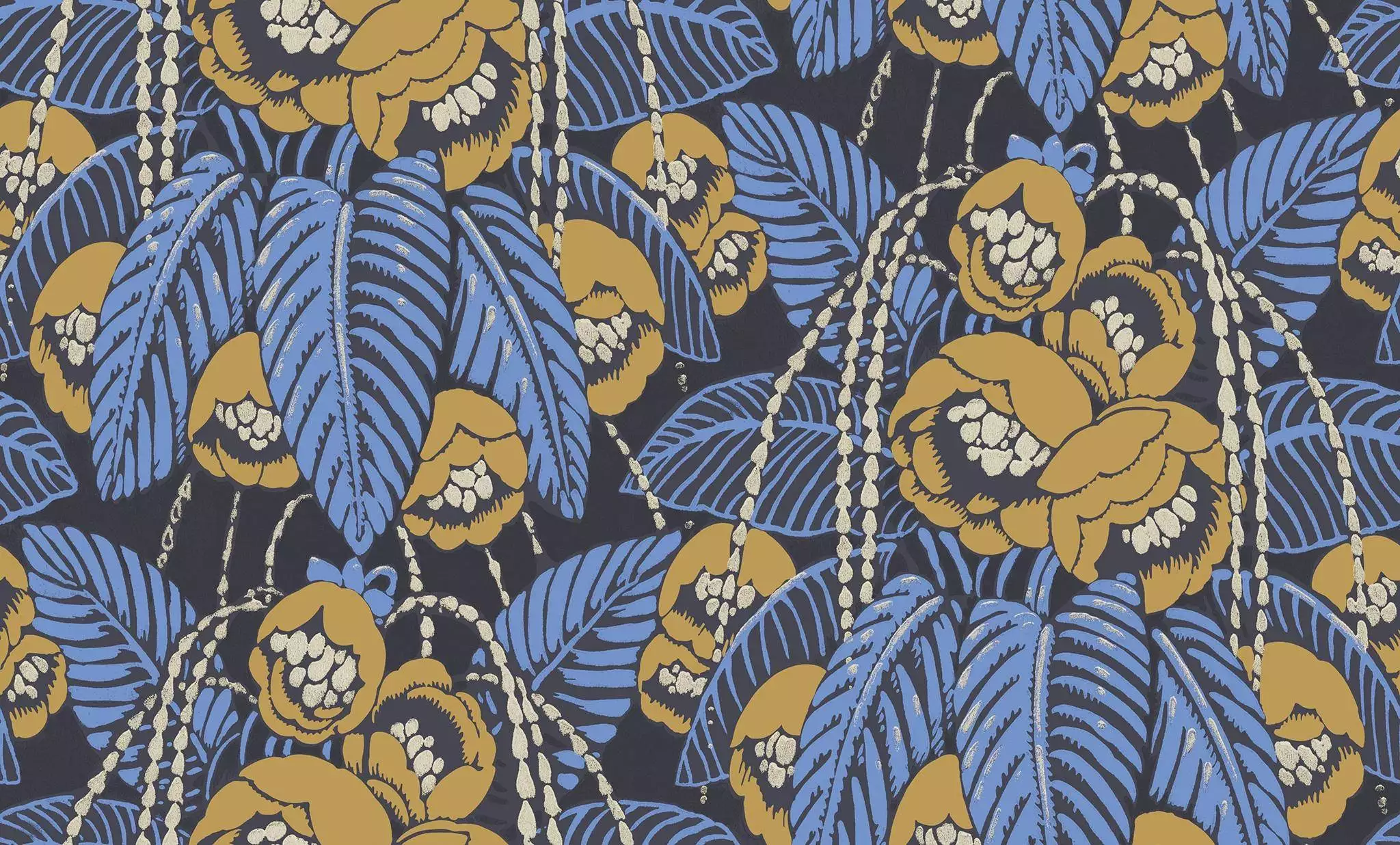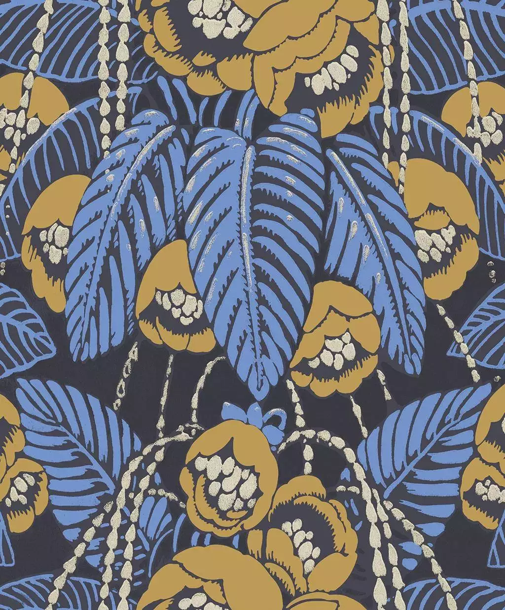 Die Tapete Gladis Amparo hat dieses besondere Etwas, das wir so sehr lieben - diese besondere Mischung aus Energie und Ruhe. Die Blätter und Blüten wirken, als hätte sie jemand mit viel Geduld auf tiefes Schwarz gesetzt. Ihr Gold-Gelb leuchtet wie kleine Highlights in einem Schattengarten. Das leuchtende Blau gibt dem Motiv eine schöne Tiefe, fast so, als würde man in verschiedene Ebenen schauen. Zu Vintage-Möbeln sieht die Tapete richtig charmant aus, und mit modernen Stücken bekommt sie eine lässige, fast spielerische Eleganz.