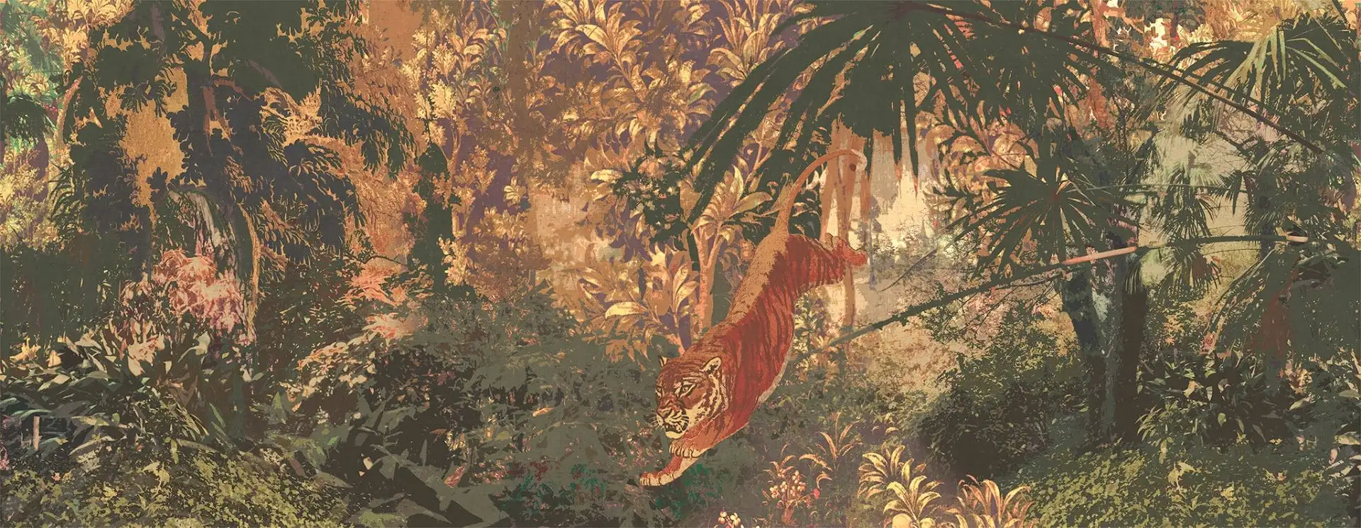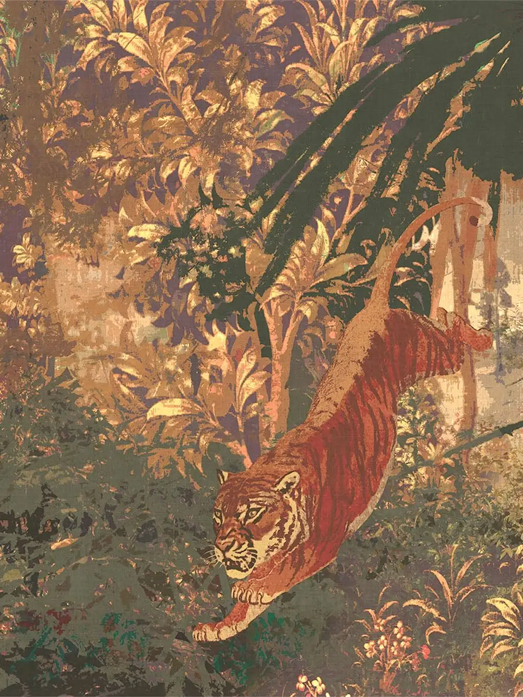 • Großformatige Muster, warme Farben und dezente Metallic-Effekte, die Tiefe und Eleganz schaffen