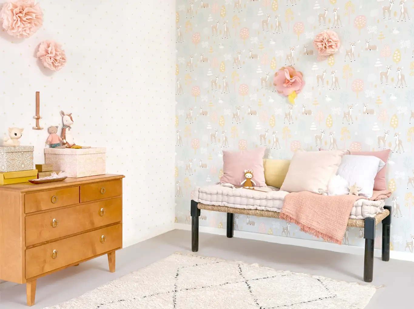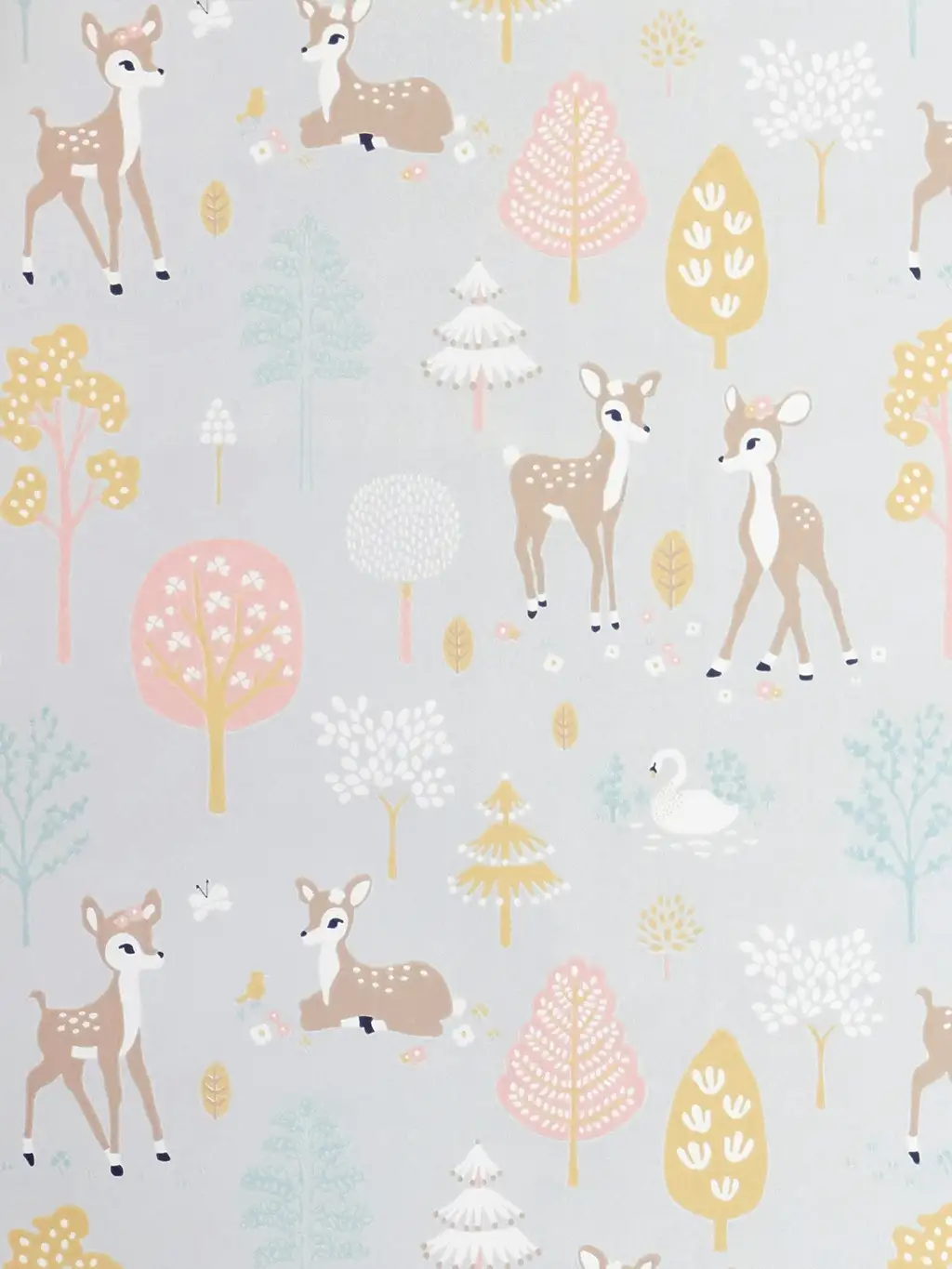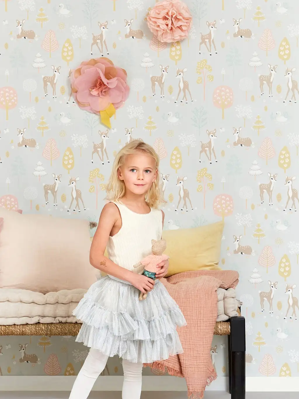 Die wunderschöne Tapete mit kleinen Rehen, Bäumchen, Gräsern und einem friedlichen Schwan gibt es in vier Farbvarianten – so werden Kinderträume wahr! Lilac, Rosè, ein helles bBau oder luftiges Mintgrün passen zu Mädchen und auch Jungen. Die Kleinen werden begeistert sein, und Sie werden das Leuchten in ihren Augen nie vergessen!