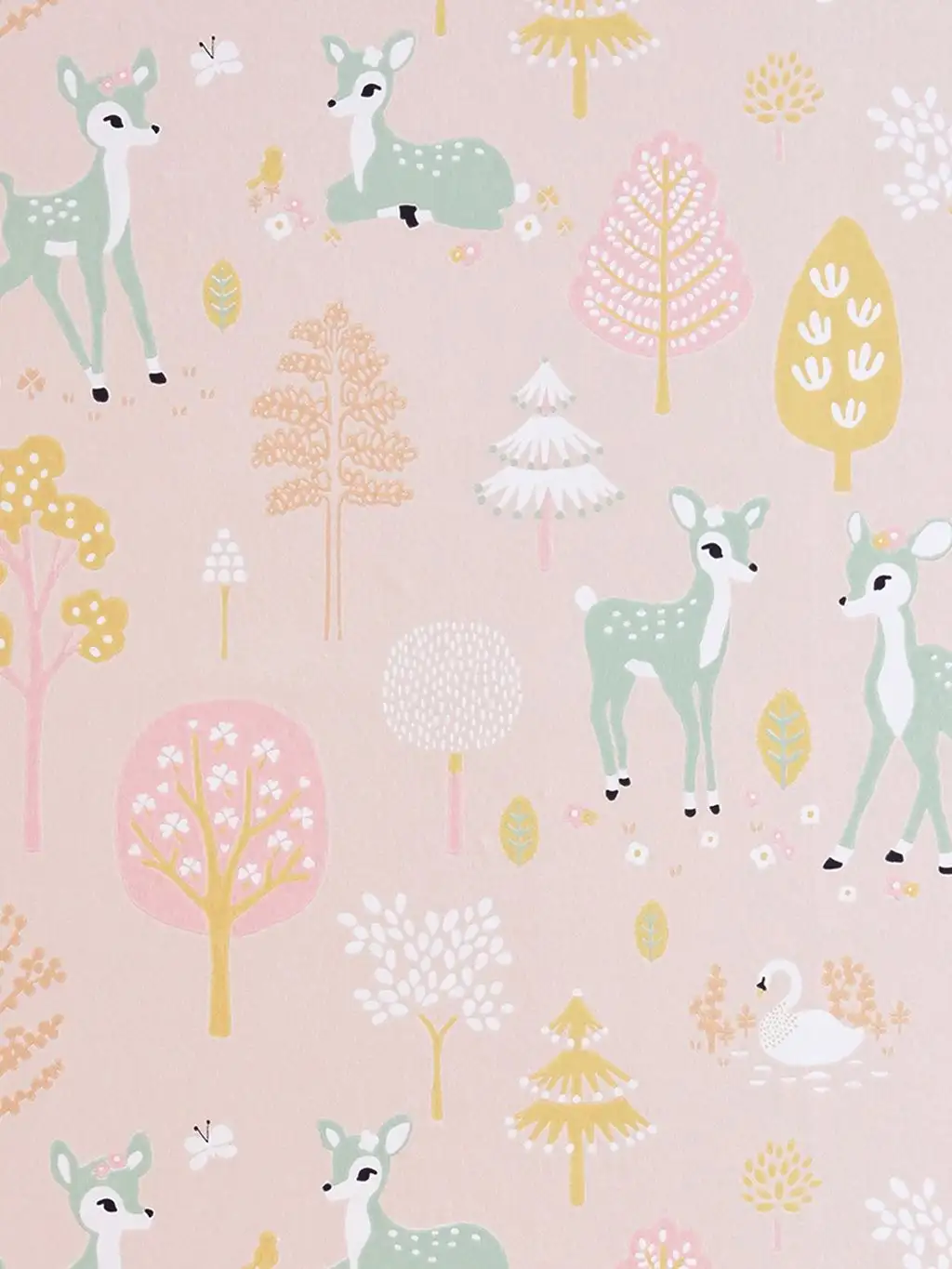 Die wunderschöne Tapete mit kleinen Rehen, Bäumchen, Gräsern und einem friedlichen Schwan gibt es in vier Farbvarianten – so werden Kinderträume wahr! Lilac, Rosè, ein helles bBau oder luftiges Mintgrün passen zu Mädchen und auch Jungen. Die Kleinen werden begeistert sein, und Sie werden das Leuchten in ihren Augen nie vergessen!