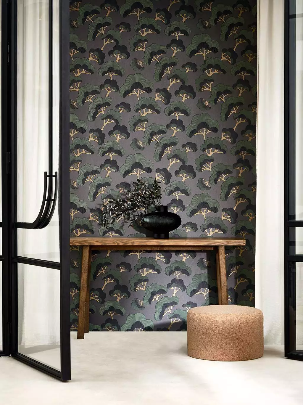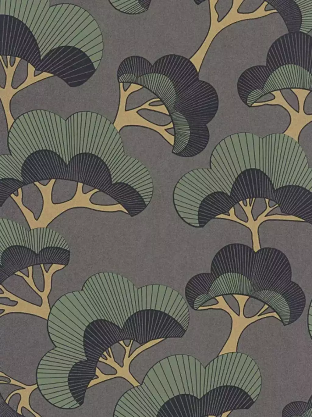 Ein rhythmisches Spiel aus dunklen Tönen: Die fächerförmigen Kiefern entfalten sich in sattem Grün und tiefem Schwarz auf einem anthrazitfarbenen Grund. Der klare grafische Aufbau verleiht der Darstellung Ruhe und Struktur, während die feinen Linien der Baumkronen eine fast textile Leichtigkeit entstehen lassen.