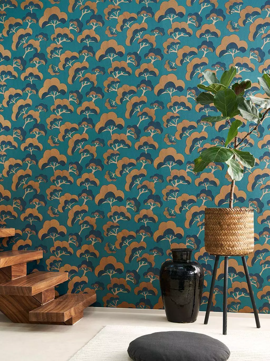 Ein Spiel aus klaren Formen und leuchtenden Farben: Die stilisierten Kiefern mit ihren fächerartigen Kronen entfalten sich in sattem Ocker und tiefem Blau auf einem türkisfarbenen Fond. Das Motiv verbindet strenge Geometrie mit einer sanften, fast ornamentalen Bewegung und erinnert zugleich an traditionelle japanische Bildwelten wie an moderne Grafik.