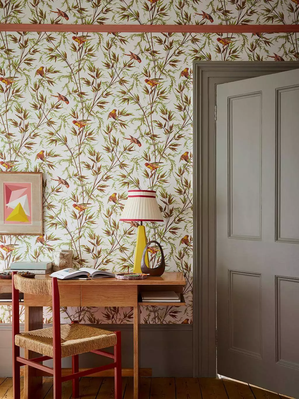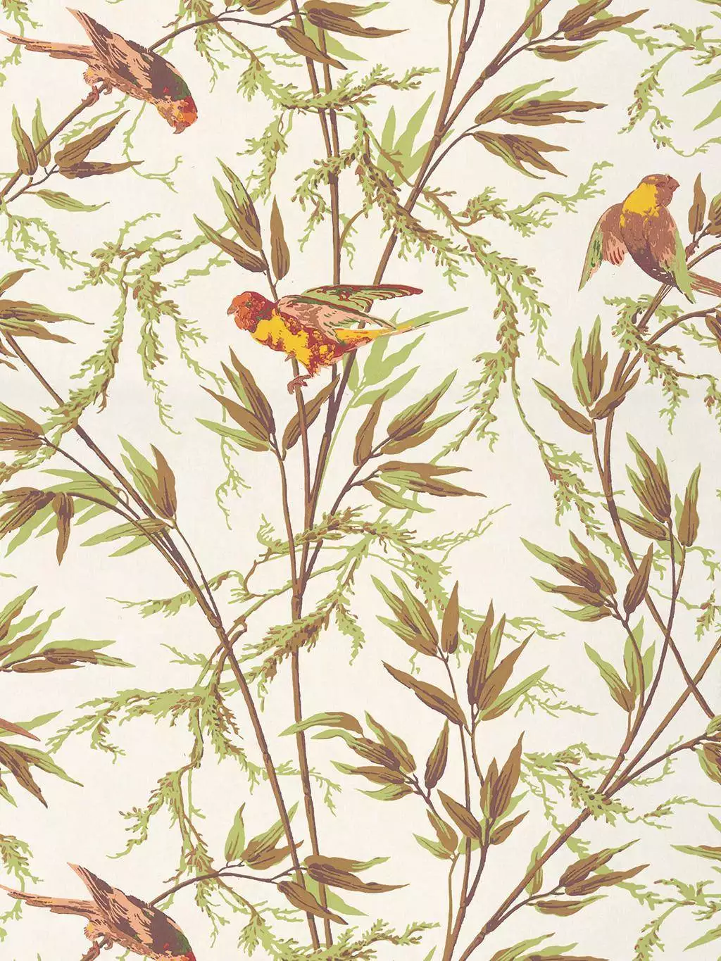 Die bezaubernde Design-Tapete Great Ormond Street zeigt ein Papageienmotiv aus dem Archiv von Little Greene im wohnlichen Farbton Galette. Das Motiv wurde in einem Londoner Stadthaus aus dem 18. Jahrhundert gefunden. Zarte Zweige in warmen Oliv- und Grüntönen überziehen die Fläche. In ihnen sitzen schelmenhaft kommunizierende Papageien in leuchtendem Rot, Gelb und warmen Brauntönen. Die Farbigkeit ist ausgewogen: natürlich, sonnig, lebendig, mit einer Prise Exotik. Durch den Oberflächendruck ist hier bezaubernd eine Struktur spürbar, eine Haptik erhalten, und im Raum entsteht eine warme, erzählerische Atmosphäre. Ruhig im Grundton, lebendig im Detail.