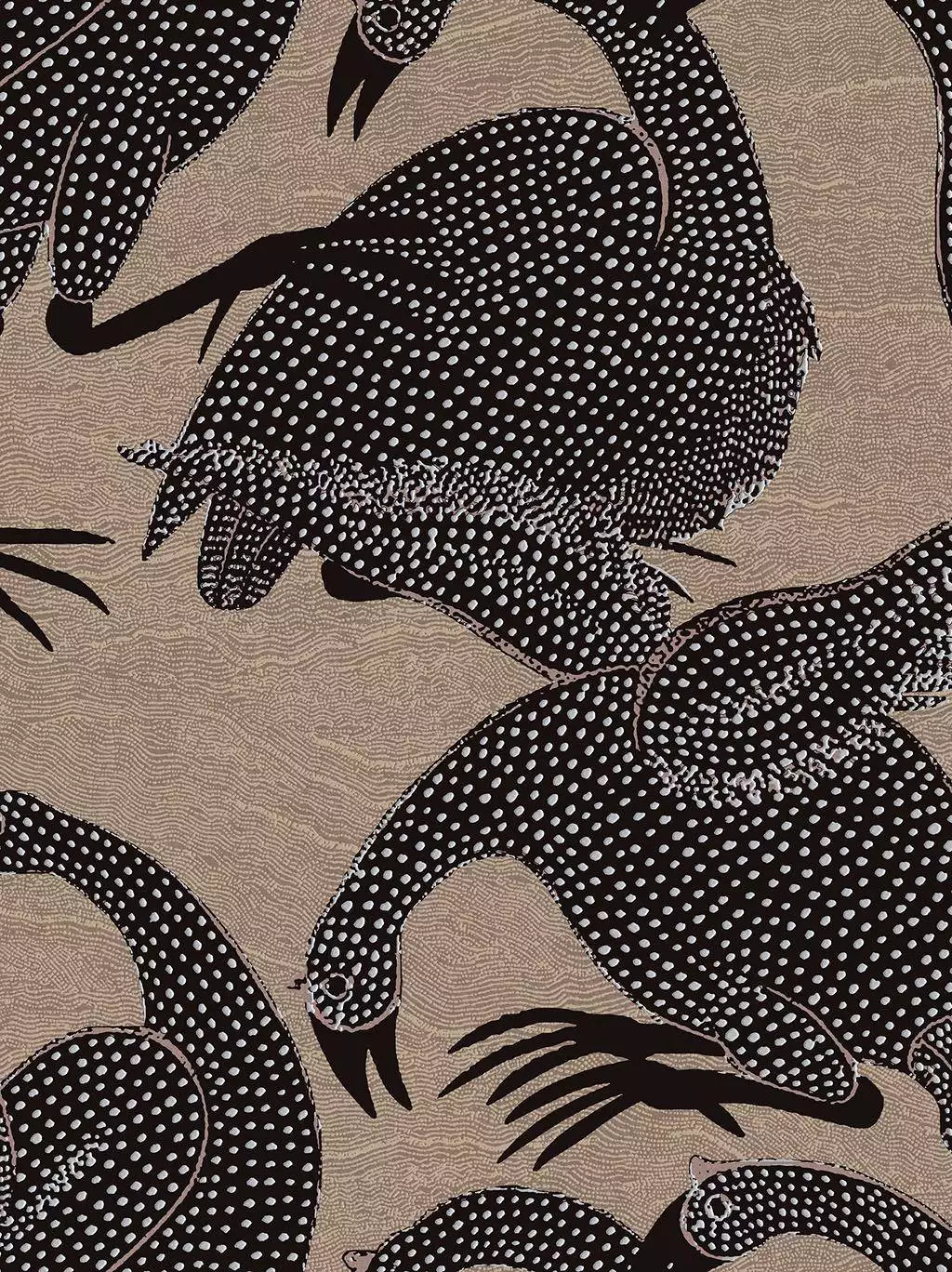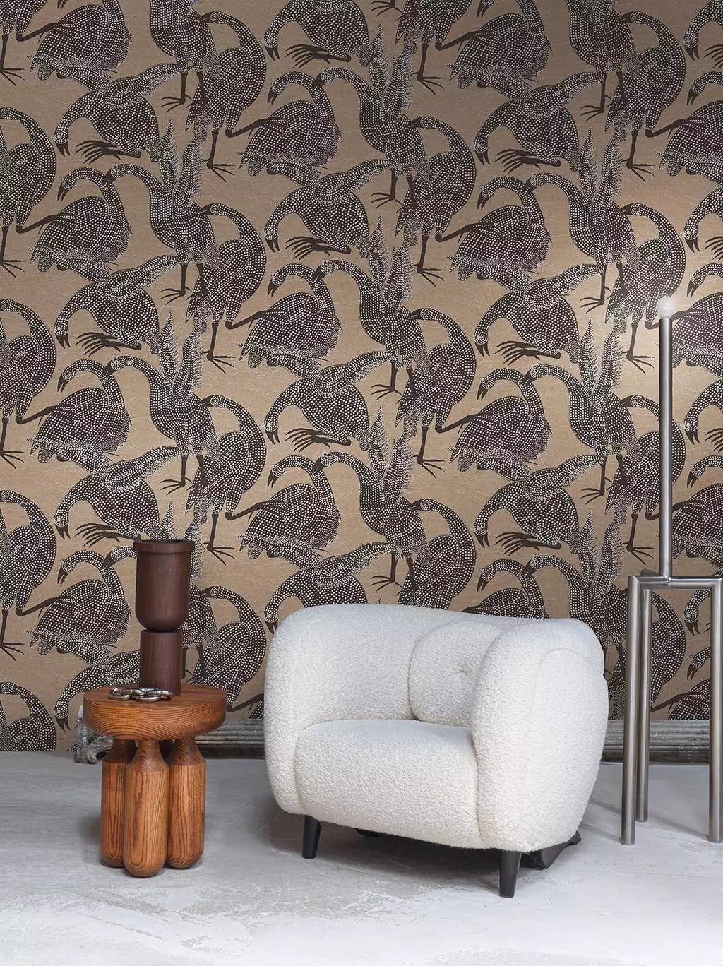 Grafisch stilisierte Perlhühner in Braun und Creme. Guinea wirkt edel, ruhig und modern – mit einem Hauch Exotik.