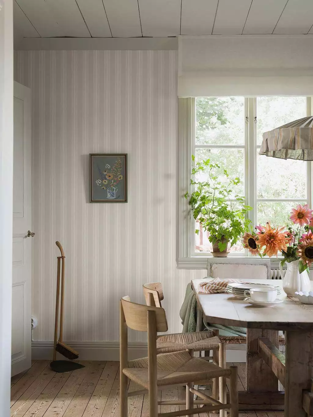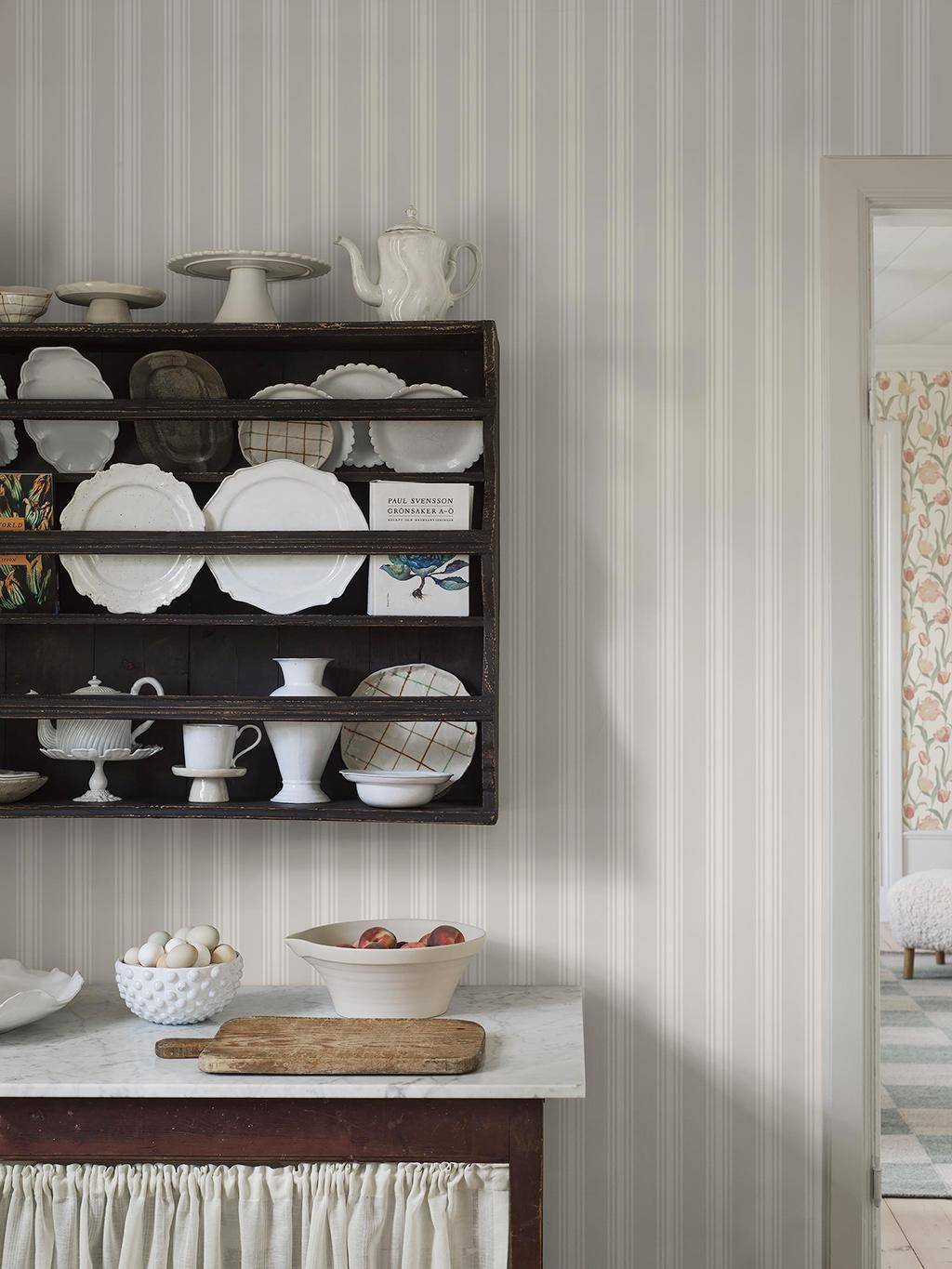 Die Tapete Gunnebo, col.01 zeigt ein klassisches Streifenmotiv in Creme und Grau. Das Zusammenspiel der hellen und dunkleren Linien ergibt ein ausgewogenes Muster mit feiner Struktur. Das Design orientiert sich an der traditionellen schwedischen Streifentapete und ist in einer dezenten, zurückhaltenden Farbigkeit umgesetzt.