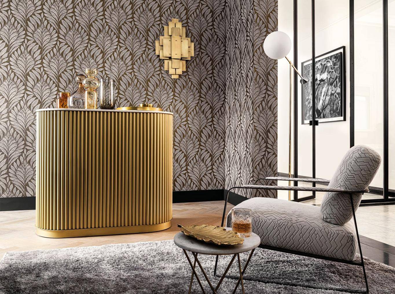 Die Tapete Gustav zeigt stilisiertes Blattwerk als florales Ornament, dessen weiche Linien und Bewegungen an die Bildsprache Gustav Klimts erinnern. Die Kombination aus Iriodin-Effekten und Kreide- beziehungsweise Metallicfolien erzeugt feine Kontraste, die je nach Licht subtil wechseln. In Blau, Anthrazit und Gold wirkt die Tapete modern und zugleich wie ein leiser Gruß der Wiener Secession; dekorativ, hochwertig und sehr ausgewogen.