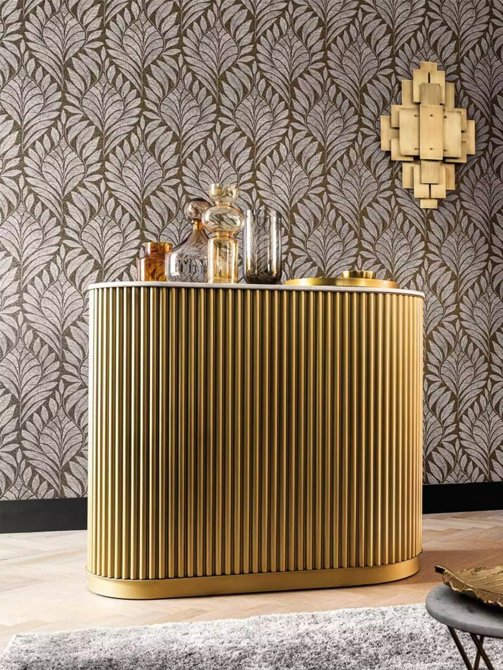 Die Tapete Gustav zeigt stilisiertes Blattwerk als florales Ornament, dessen weiche Linien und Bewegungen an die Bildsprache Gustav Klimts erinnern. Die Kombination aus Iriodin-Effekten und Kreide- beziehungsweise Metallicfolien erzeugt feine Kontraste, die je nach Licht subtil wechseln. In Blau, Anthrazit und Gold wirkt die Tapete modern und zugleich wie ein leiser Gruß der Wiener Secession; dekorativ, hochwertig und sehr ausgewogen.