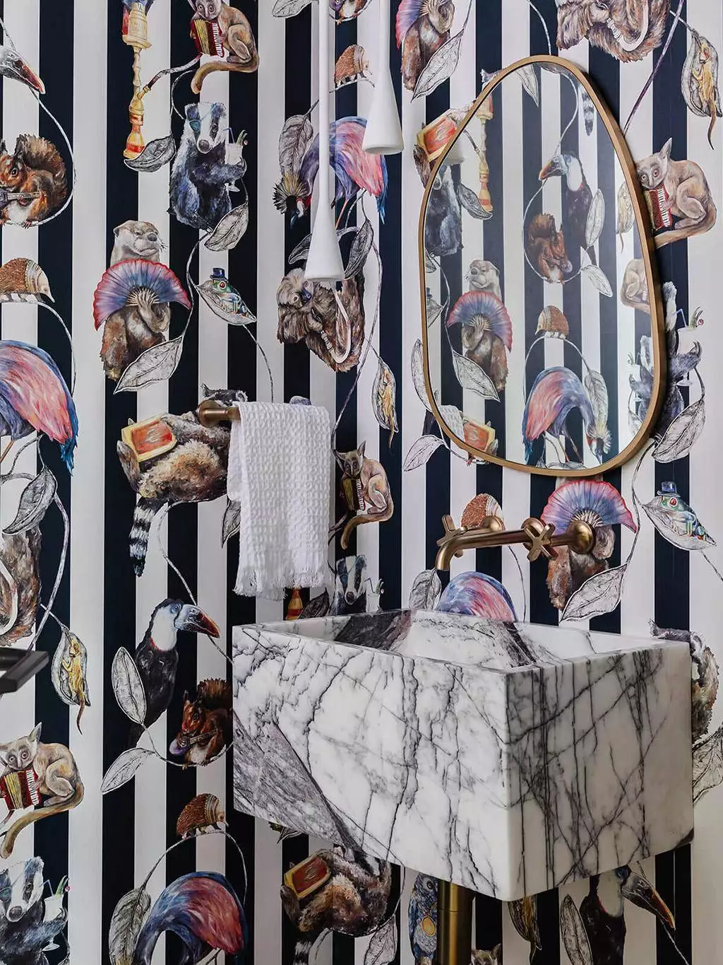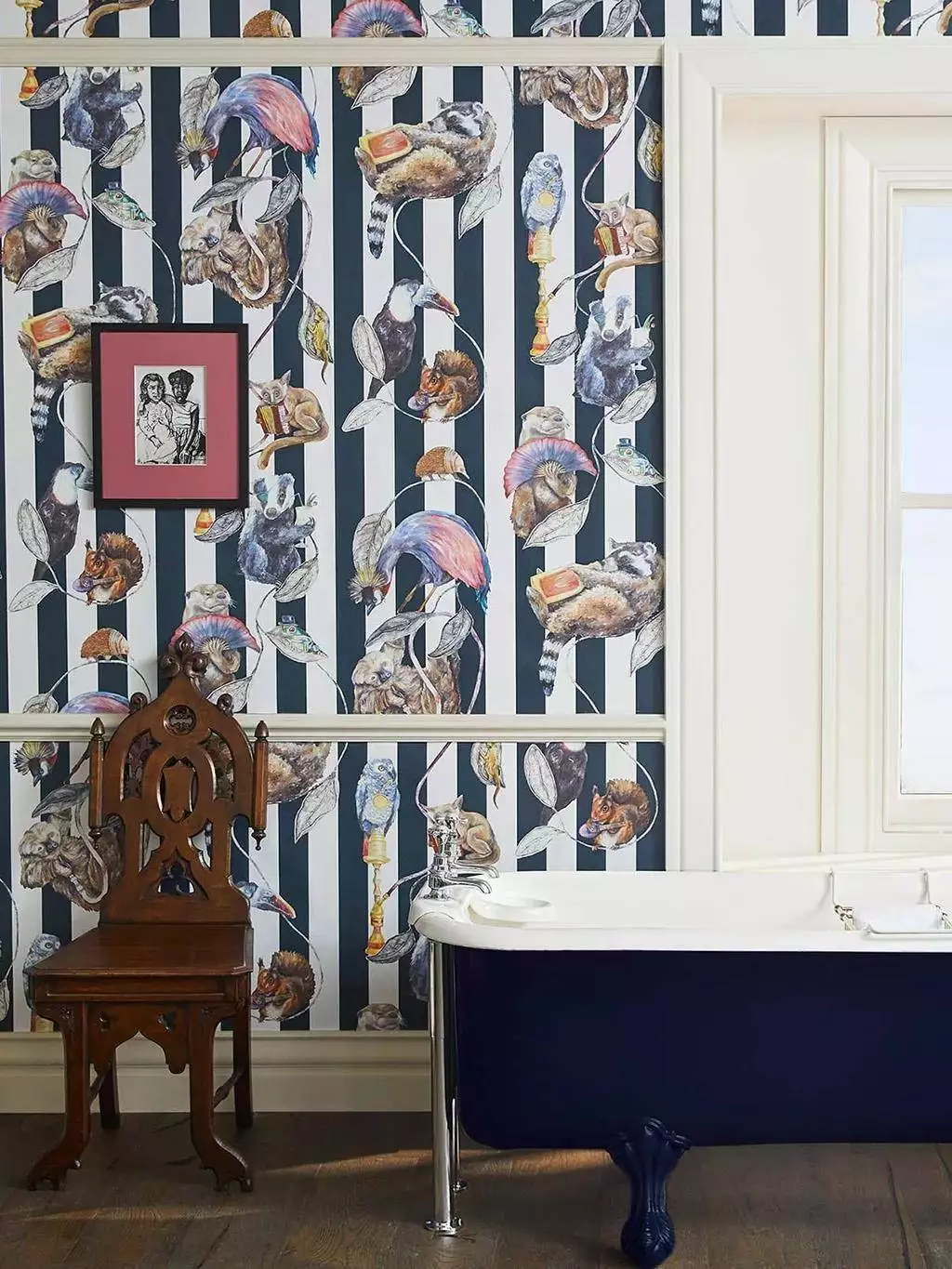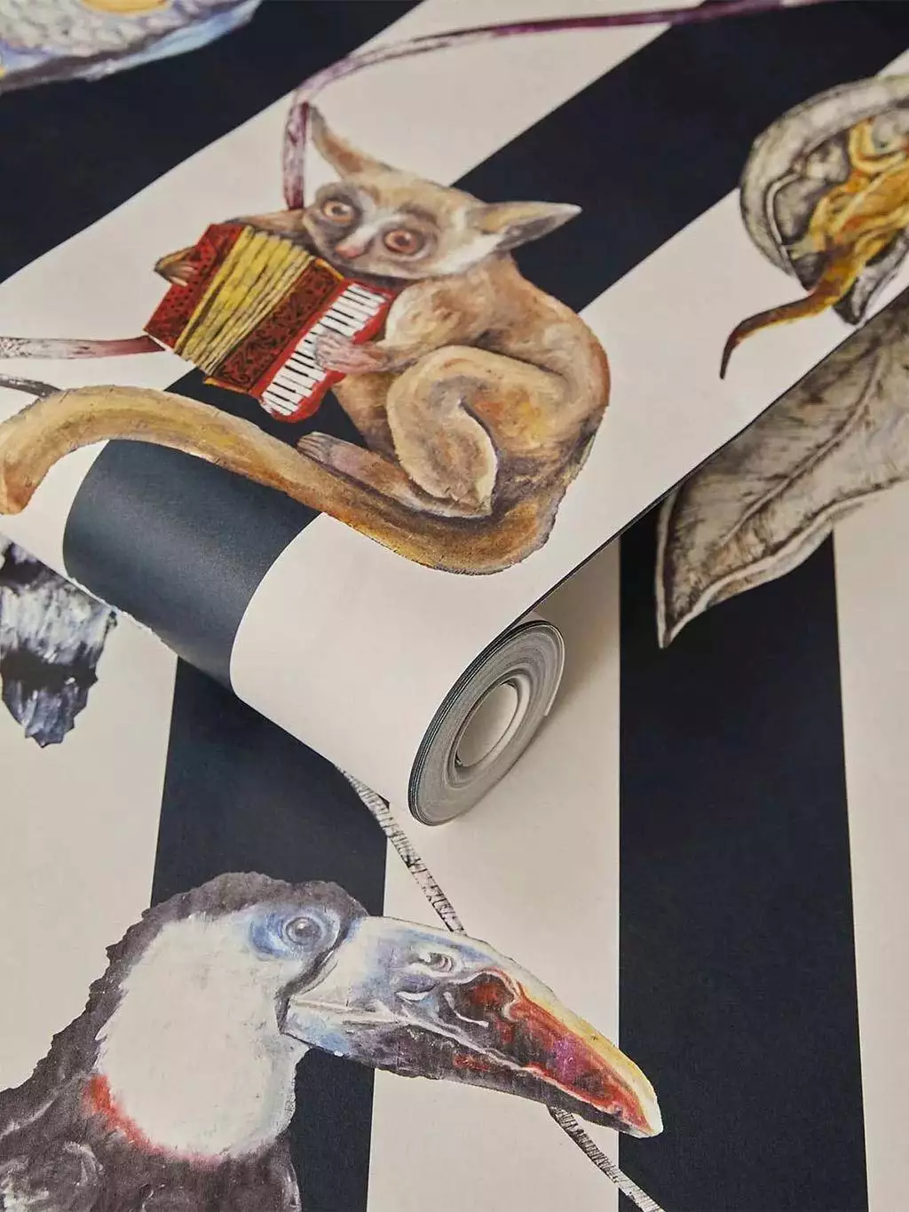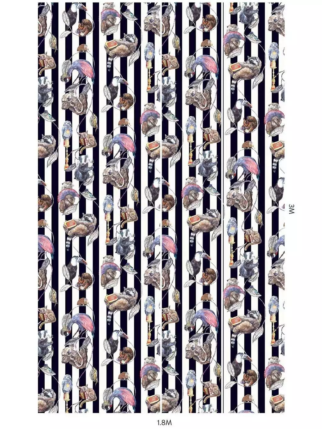 Die Hackney Empire Tapete in Midnight Stripe von House of Hackney besticht durch fantasievolle Darstellungen von Tieren in menschlichen Posen und Kostümen: Ein Faultier mit Wasserpfeife, ein Frosch mit Melone und ein Dachs mit Cocktailglas sind nur einige der charmanten Figuren, die in diesem ikonischen Design zu sehen sind. Diese Version mit Mitternachtsblau und weißen Streifen verleiht dem beliebten Motiv von House of Hackney einen eleganten monochromen Touch.