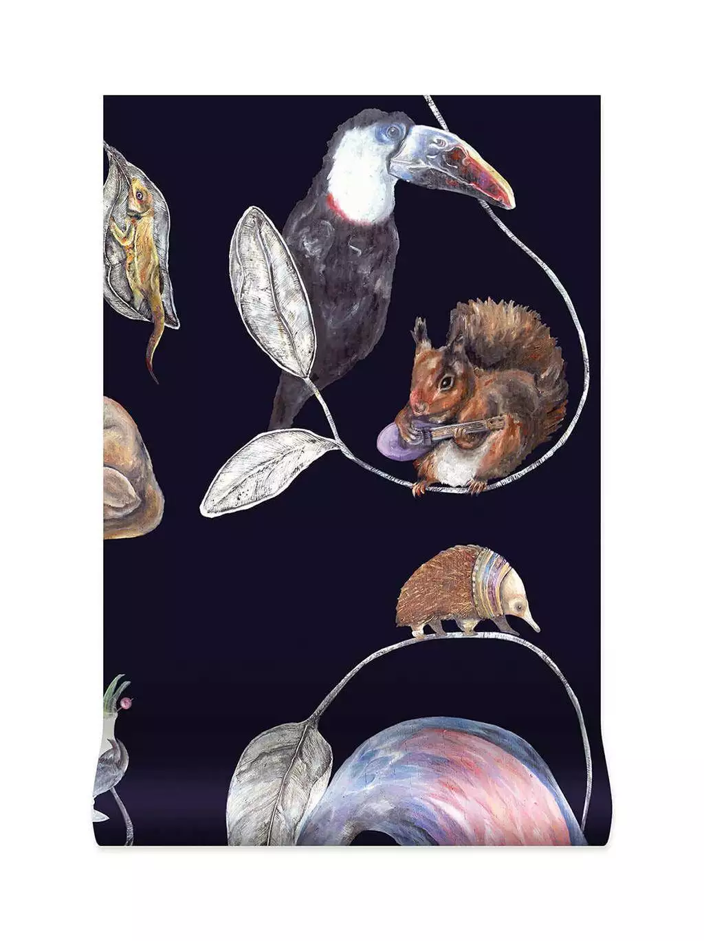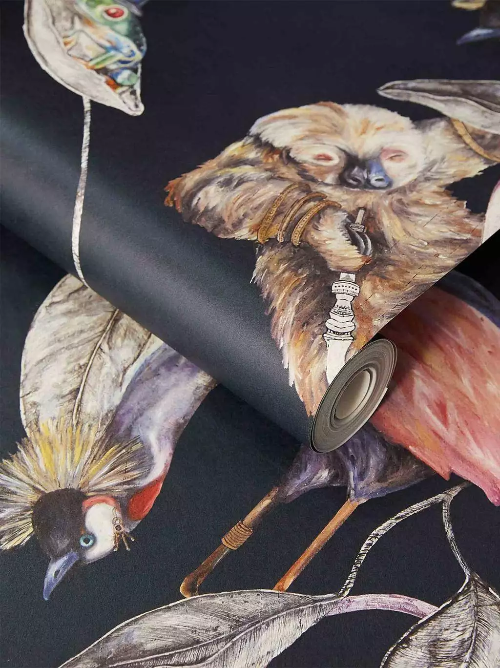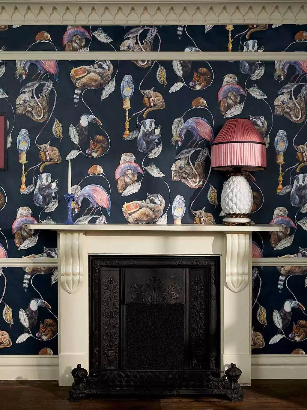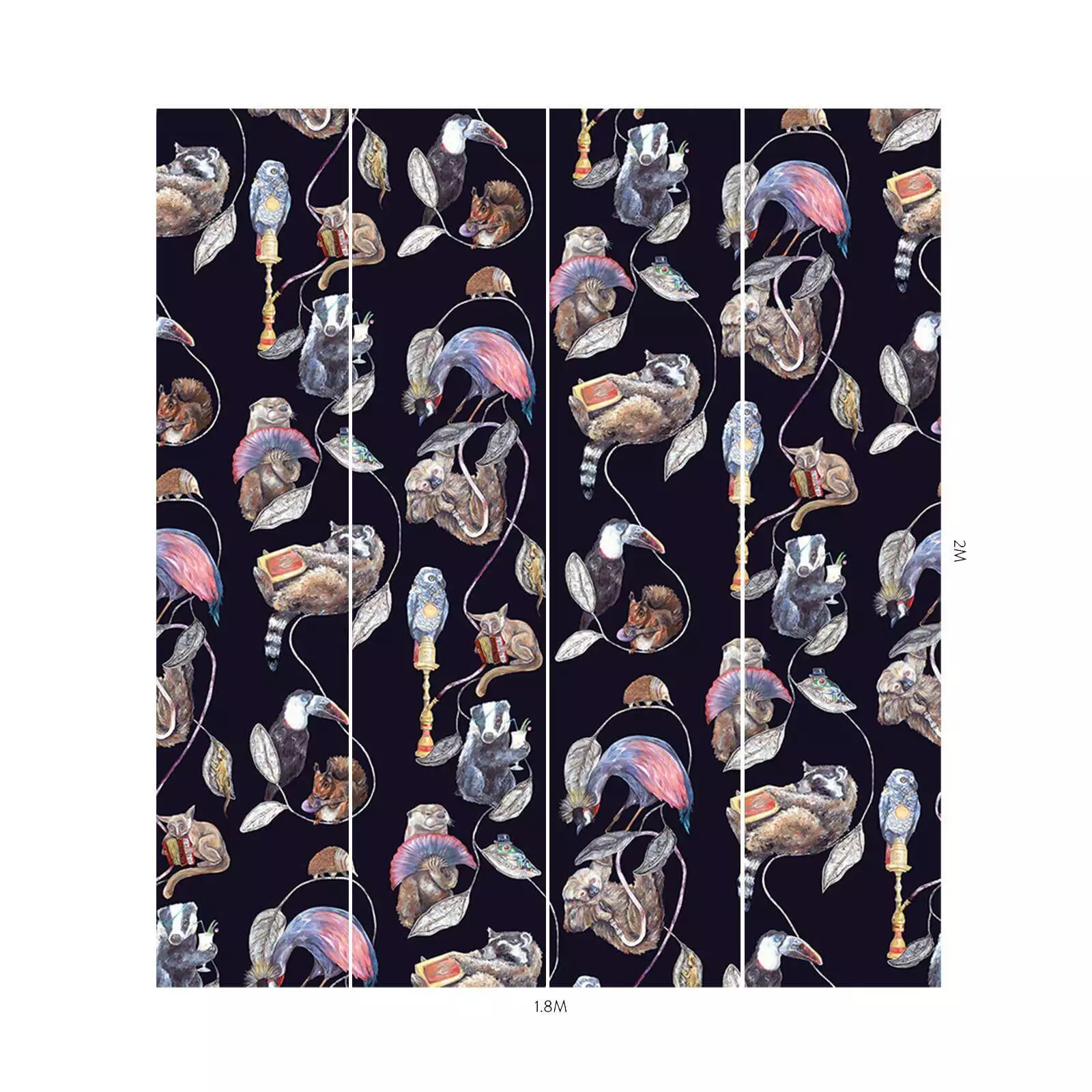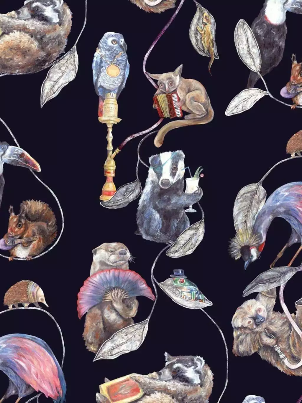 Die Hackney Empire Tapete in Midnight von House of Hackney besticht durch fantasievolle Darstellungen von Tieren in menschlichen Posen und Kostümen: Ein Faultier mit Wasserpfeife, ein Frosch mit Melone und ein Dachs mit Cocktailglas sind nur einige der charmanten Figuren, die in diesem ikonischen Design zu sehen sind. Der tiefblaue Hintergrund in Kombination mit leuchtenden Juwelentönen verleiht dem Muster eine luxuriöse und zugleich spielerische Ausstrahlung.