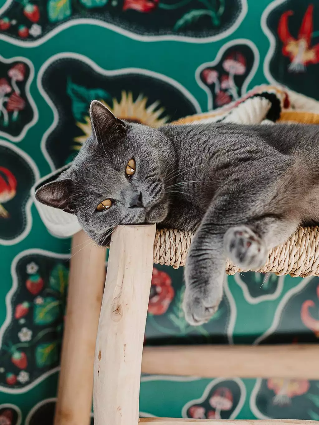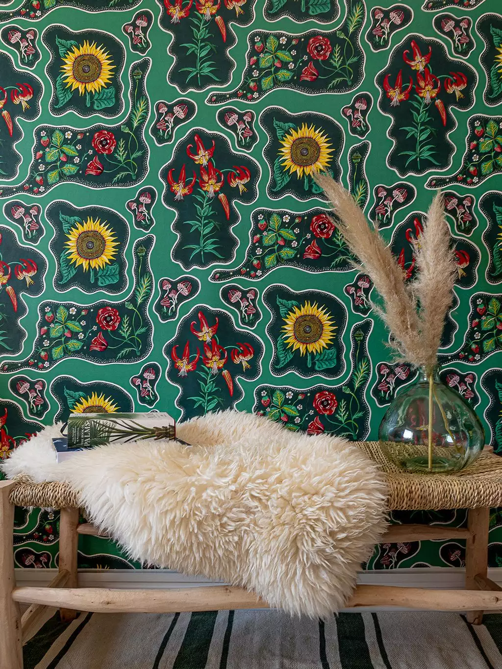 die handgemalte Tapete Halcyon ist eine Hommage an die sorglosen 70er Jahre, die Flower-Power-Ära! Das Wort Halcyon steht für eine Zeit, die glückselig war. Dieser atemberaubende Blumendruck wird Sie sicherlich dorthin zurückversetzen! Mit kühnen Sonnenblumen, Erdbeeren, Pilzen und Mohnblumen in einem verspielten psychedelischen Muster und in einem von Juwelen inspirierten Smaragdgrün.