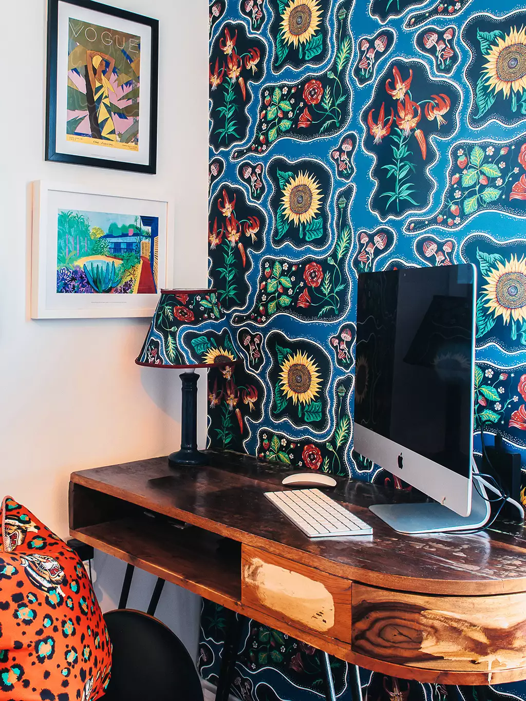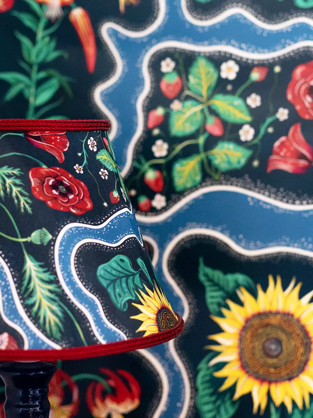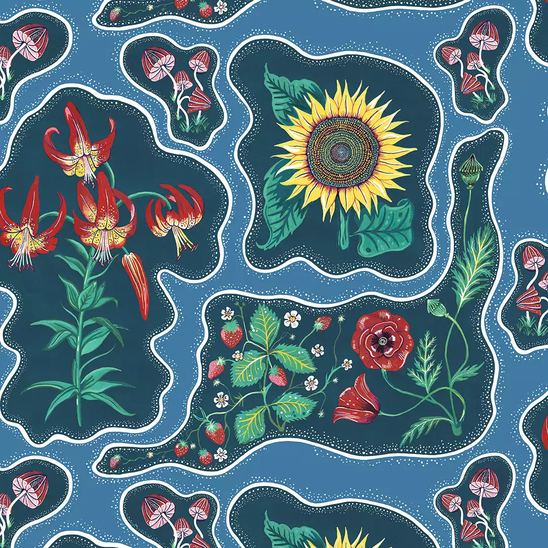 die handgemalte Tapete Halcyon ist eine Hommage an die sorglosen 70er Jahre, die Flower-Power-Ära! Das Wort Halcyon steht für eine Zeit, die glückselig war. Dieser atemberaubende Blumendruck wird Sie sicherlich dorthin zurückversetzen! Mit kühnen Sonnenblumen, Erdbeeren, Pilzen und Mohnblumen in einem verspielten psychedelischen Muster und in einem von Juwelen inspirierten Smaragdgrün.