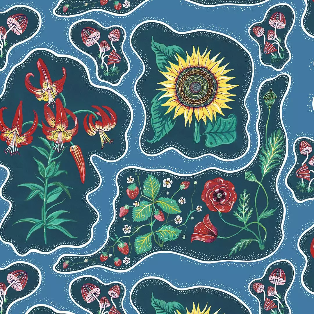die handgemalte Tapete Halcyon ist eine Hommage an die sorglosen 70er Jahre, die Flower-Power-Ära! Das Wort Halcyon steht für eine Zeit, die glückselig war. Dieser atemberaubende Blumendruck wird Sie sicherlich dorthin zurückversetzen! Mit kühnen Sonnenblumen, Erdbeeren, Pilzen und Mohnblumen in einem verspielten psychedelischen Muster und in einem von Juwelen inspirierten Smaragdgrün.