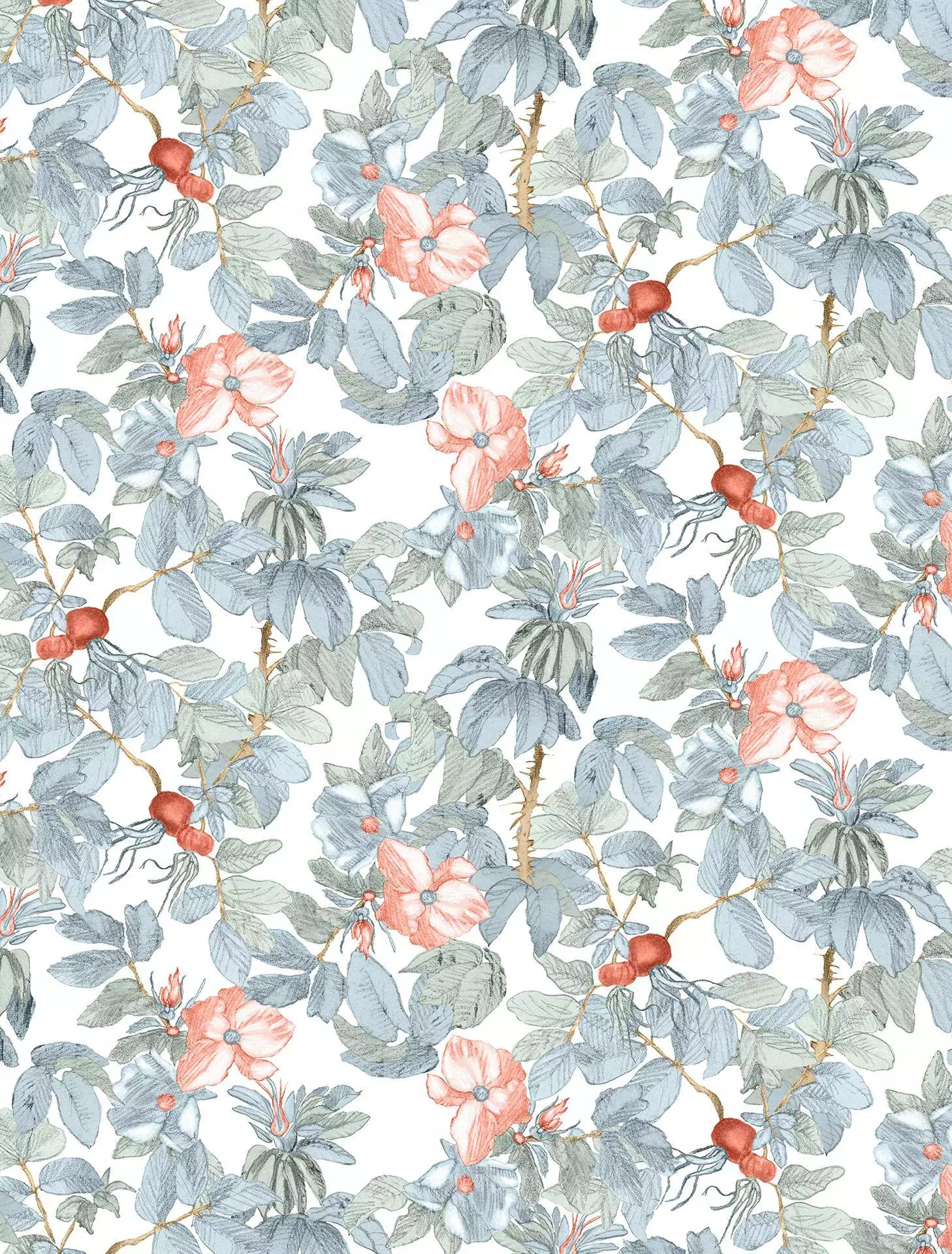 Nach einem langen Spätsommertag trägt der Wind den zarten Duft der Heckenrose durch den Garten und die roten Früchte der Hagebutte leuchten in der Abendsonne. Dieses hingezeichnete Muster entstand im Garten meiner Großeltern.