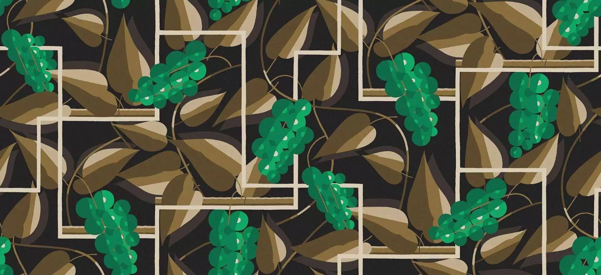 Die Tapete Henry spielt mit den Formen des Art déco: geometrische Linien, überlagert von Blättern und Trauben in sattem Smaragdgrün. Goldene und bronzefarbene Nuancen setzen metallische Akzente, die an die Eleganz der 20er Jahre erinnern. Das tiefe Schwarz im Hintergrund verstärkt die grafische Wirkung und lässt die Farben leuchten. Ein Entwurf voller Rhythmus und Glamour, der die Atmosphäre von Jazz, Architektur und mondäner Lebensfreude in ein zeitgenössisches Format übersetzt.