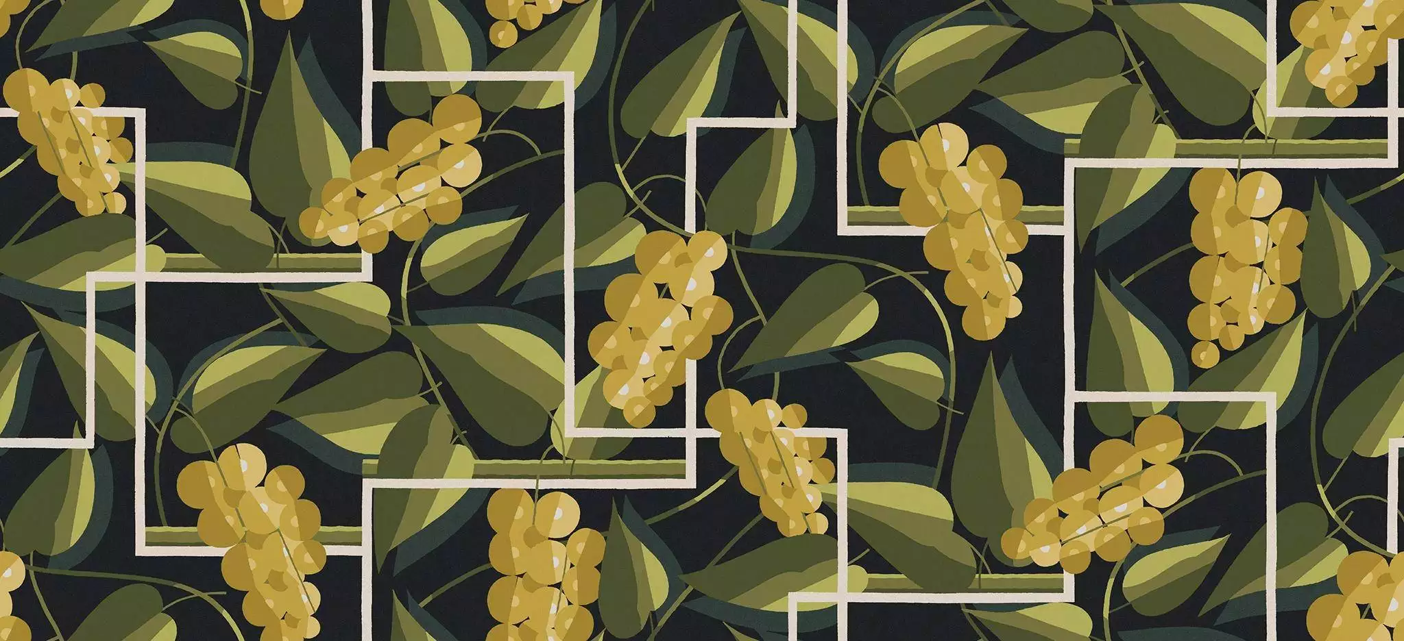 Die Tapete Henry in Oasis bringt Art-déco-Elemente in eine frische, grüne Farbwelt. Geometrische Linien strukturieren das Muster, dazwischen ranken große Blätter und Trauben in sattem Gelb. Der Kontrast zwischen klarer Ordnung und organischer Fülle erinnert an die mondäne Eleganz der 20er Jahre, übersetzt in eine zeitgemäße Sprache. Das tiefe Dunkelgrün im Hintergrund verstärkt die Strahlkraft der Farben und verleiht dem Motiv eine fast opulente Präsenz. Ein Entwurf, der Architektur, Natur und Glamour kunstvoll verbindet.