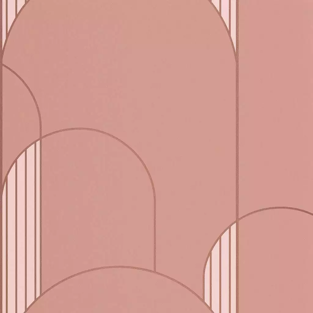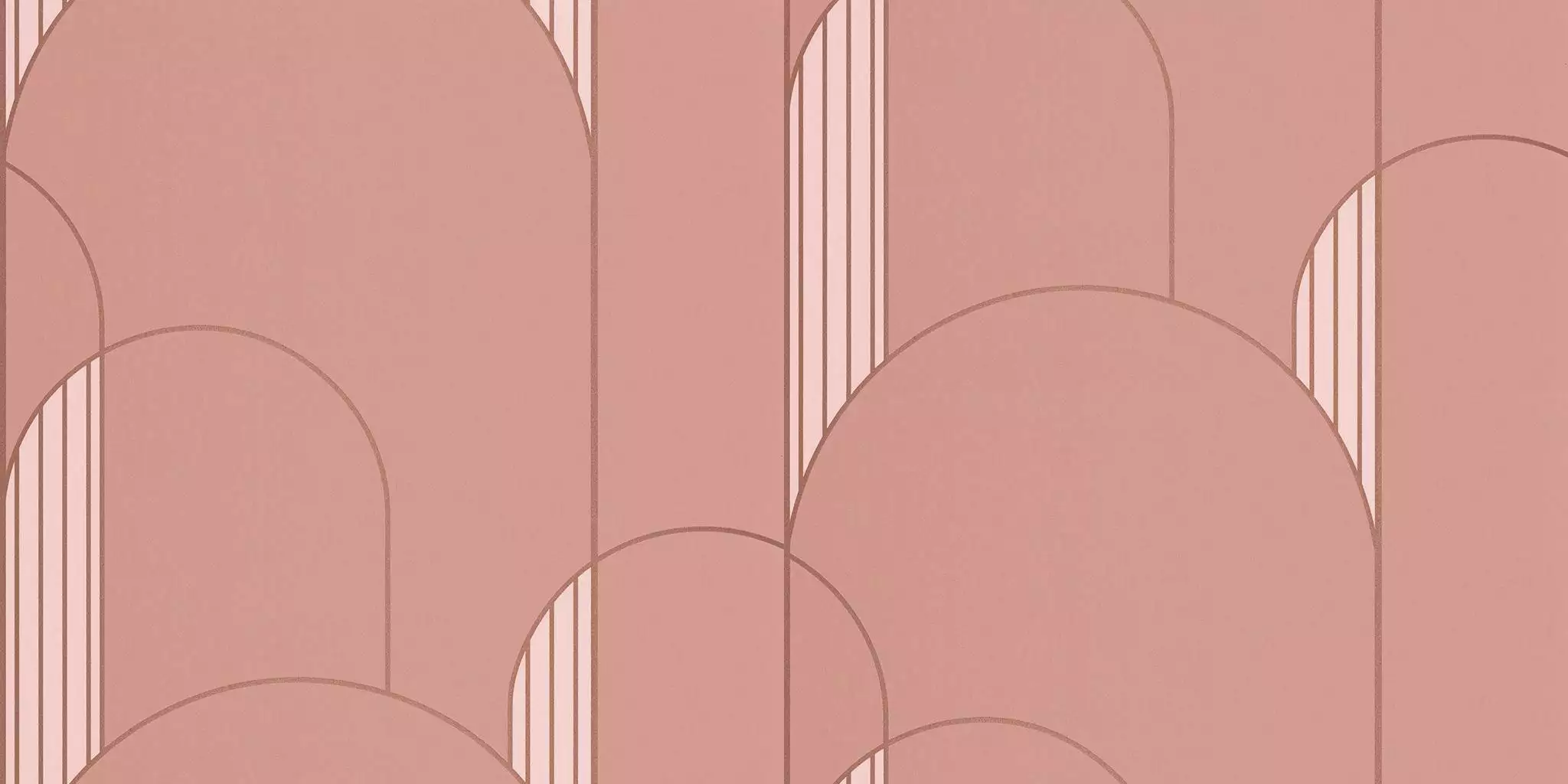 Die Tapete High Walls, col. 4 kombiniert sanfte Rosatöne mit einem grafischen Bogenmuster, das durch feine Linien vertikal gegliedert ist. Die Anordnung wirkt ruhig und geordnet, ohne monoton zu sein. Der warme Farbton und die gleichmäßige Struktur verleihen der Fläche Tiefe und eine zurückhaltende Lebendigkeit.