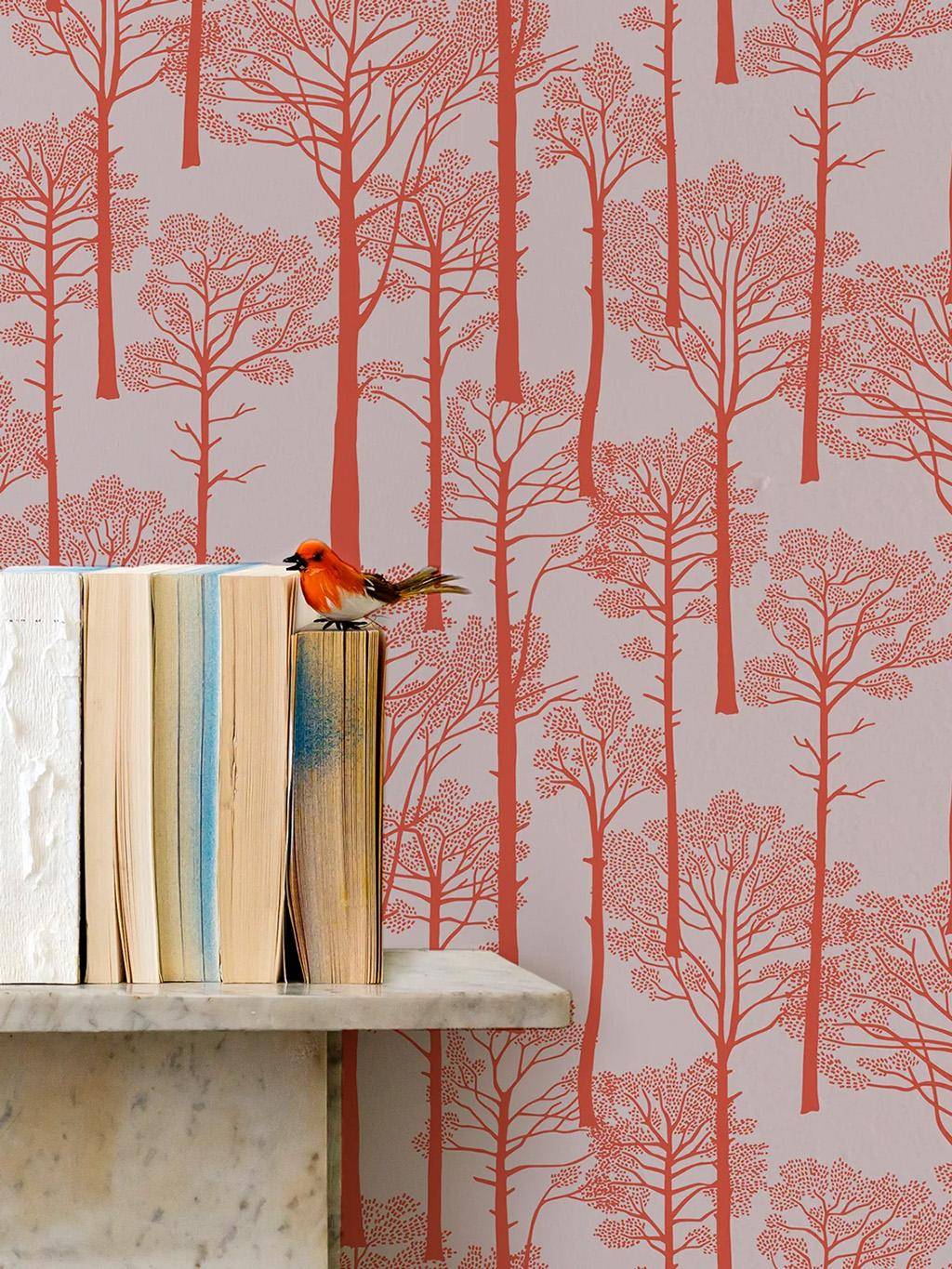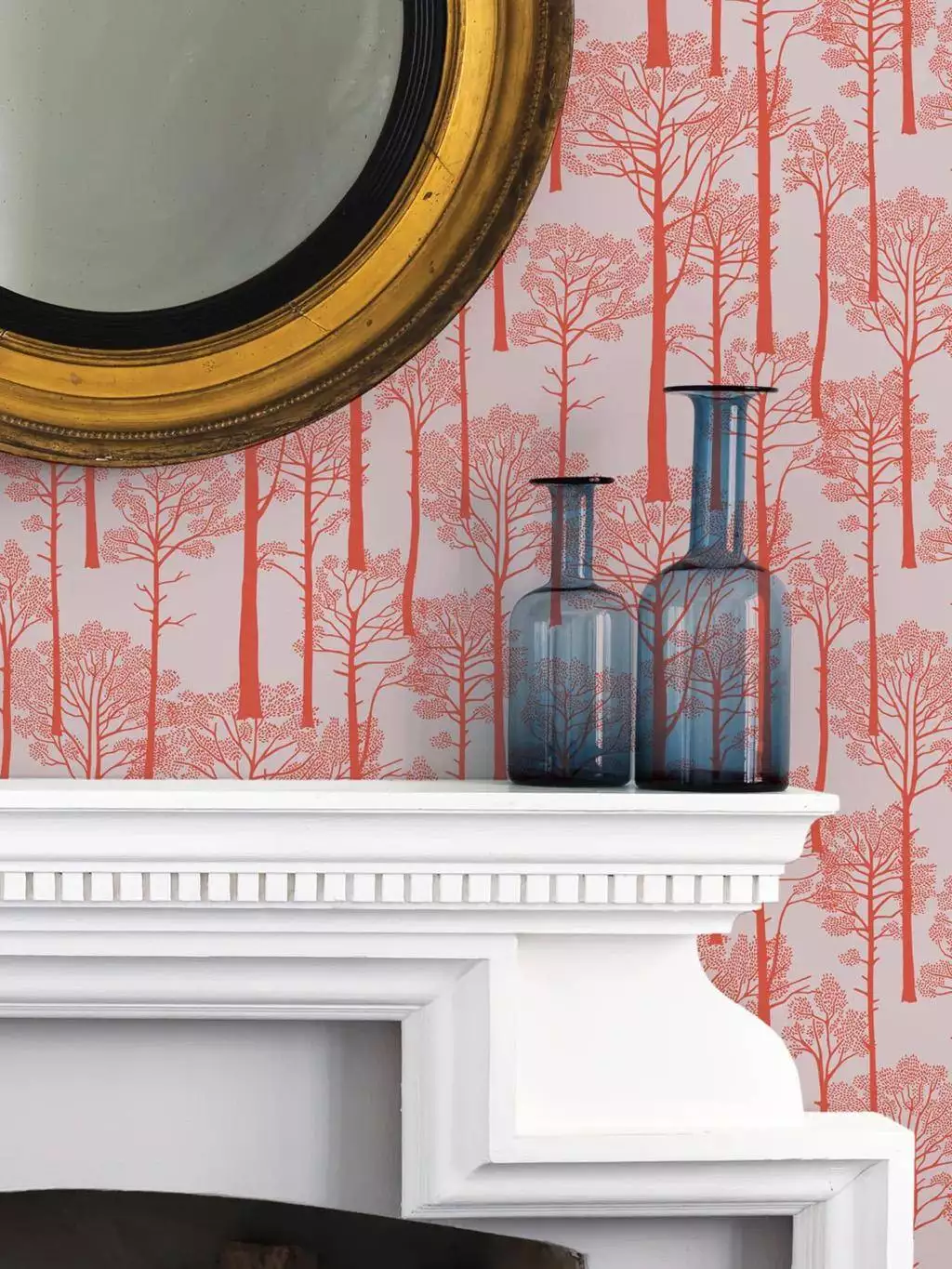 Die Tapete Holkham Pines von Bold & Noble in der Farbvariante Sunrise Orange zeigt stilisierte Kiefern in einem lebendigen Orangeton auf zartem Rosé-Hintergrund und fängt die stille Eleganz eines lichten Pinienwalds ein. Das grafische Baummotiv zieht sich rhythmisch über die Wand und bringt Struktur sowie eine natürliche Ruhe in den Raum - grafisch präzise und zugleich poetisch. Die feine Linienführung und die leuchtende Farbgebung verbinden Natur und Gestaltung in einer kraftvoll stillen Bildsprache. Handgezeichnet im Bold & Noble Studio in Hertfordshire und gedruckt in Lancashire in einer der letzten noch existierenden Tapetenfabriken Großbritanniens. Diese Qualitätstapete wird mit Farben auf Wasserbasis auf flammhemmendes PEFC-Papier gedruckt.