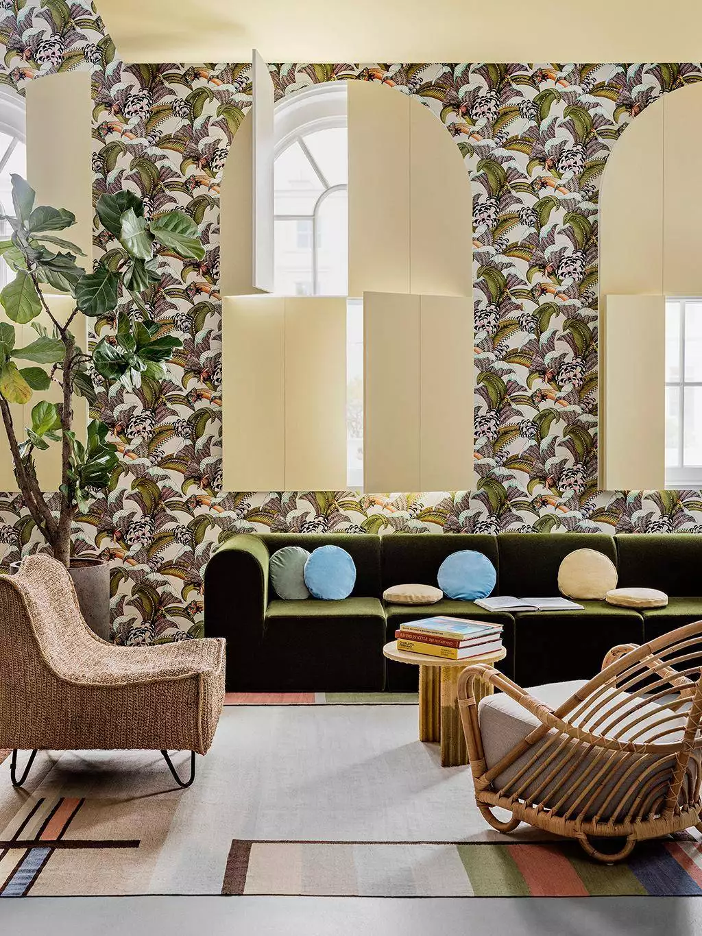 Die Farbpalette spielt mit kräftigem Frühlingsgrün, tiefem Oliv und warmen Nuancen von Rosa, Koralle und Sonnengelb. Akzente in sanftem Blau setzen subtile Kontraste, während die Grundtöne zwischen nachtschwarzem Himmel und staubiger Savanne variieren.