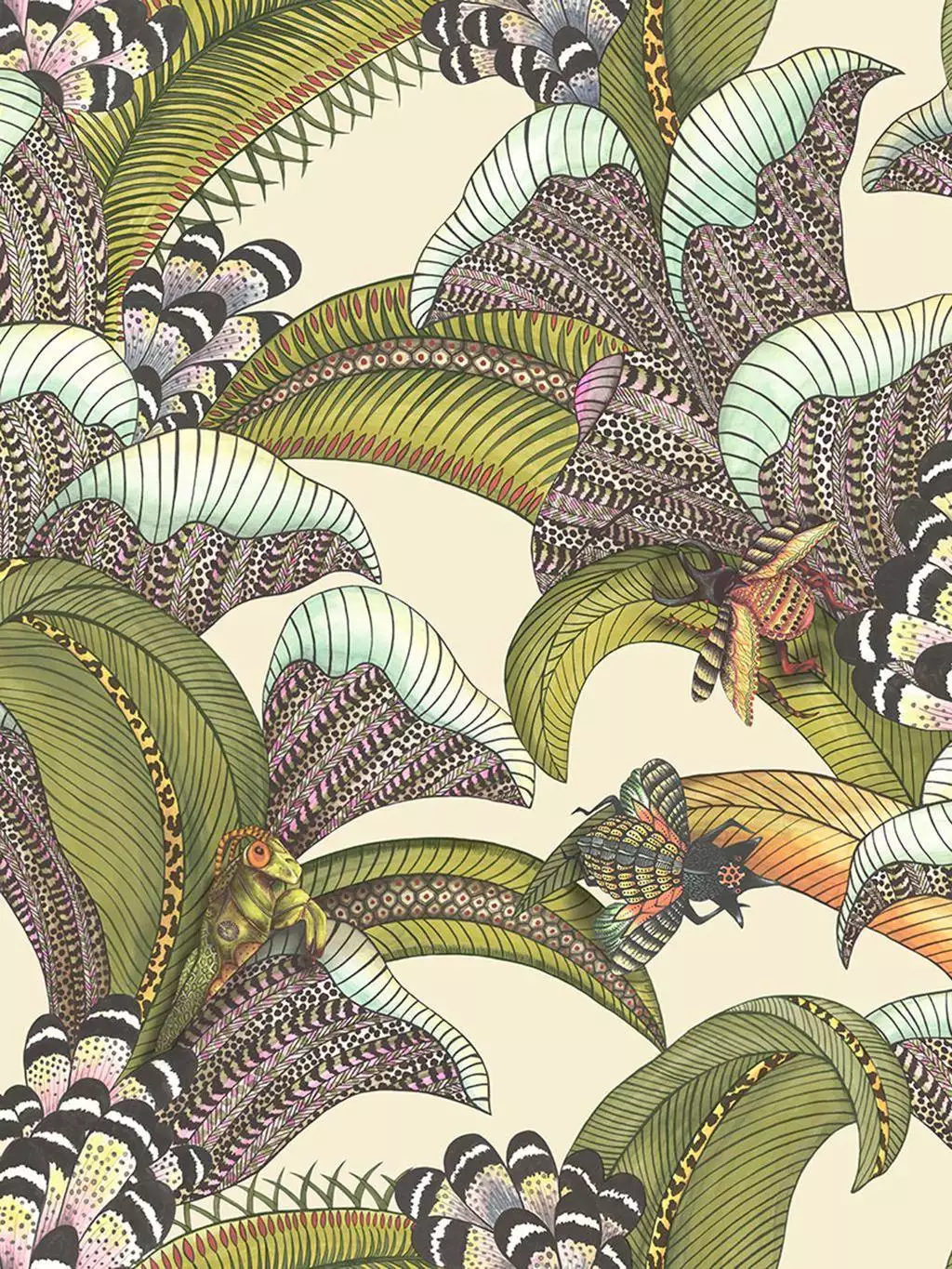 Ein dichtes Labyrinth aus Blättern, Wedeln und Blüten zieht sich durch das Motiv Hoopoe Leaves. Versteckt im Laub entfaltet sich die Vielfalt der Natur: Exotische Wiedehopfvögel mit gefiederten Kronen, kunstvoll verzierte Käfer und eine wachsame Gottesanbeterin fügen sich in das ornamentale Muster ein. Jedes Element ist fein gestaltet und erinnert in seinen Details an traditionelle Zulu-Perlenarbeiten.
