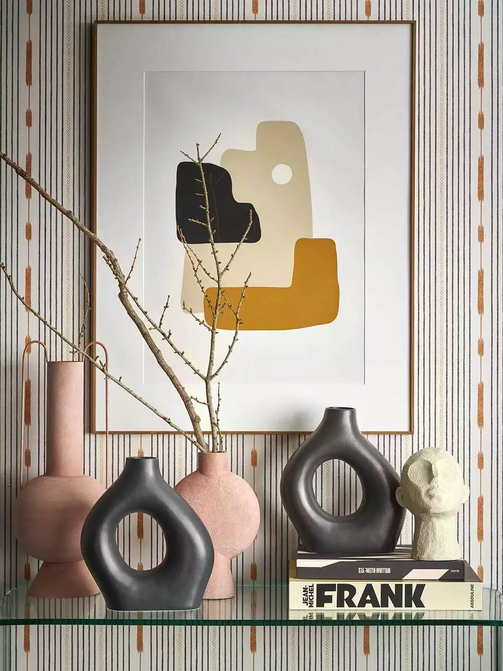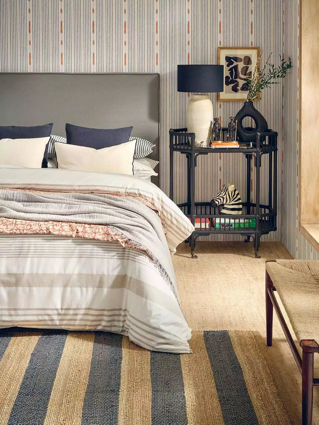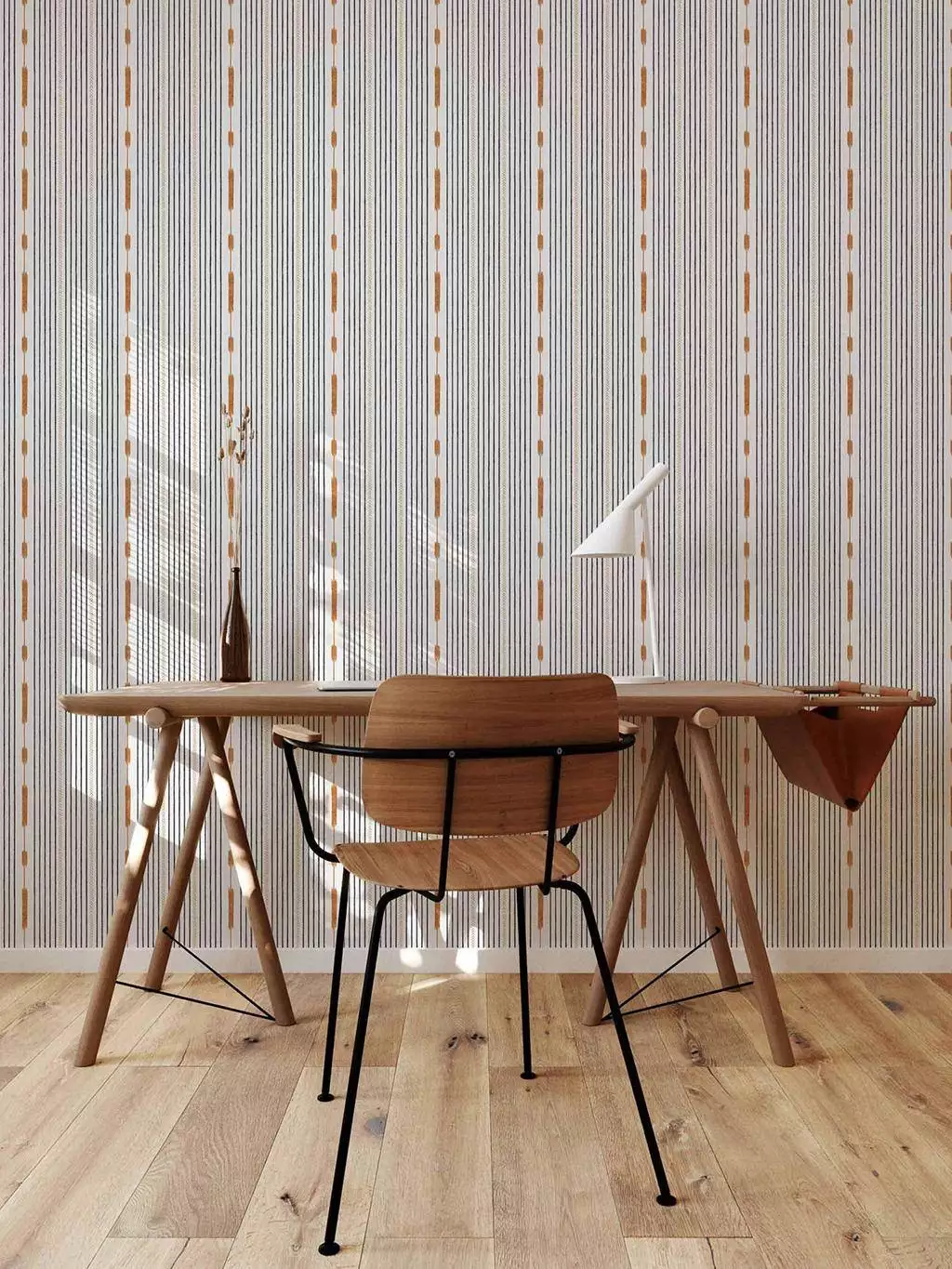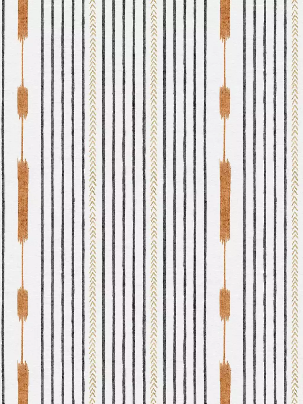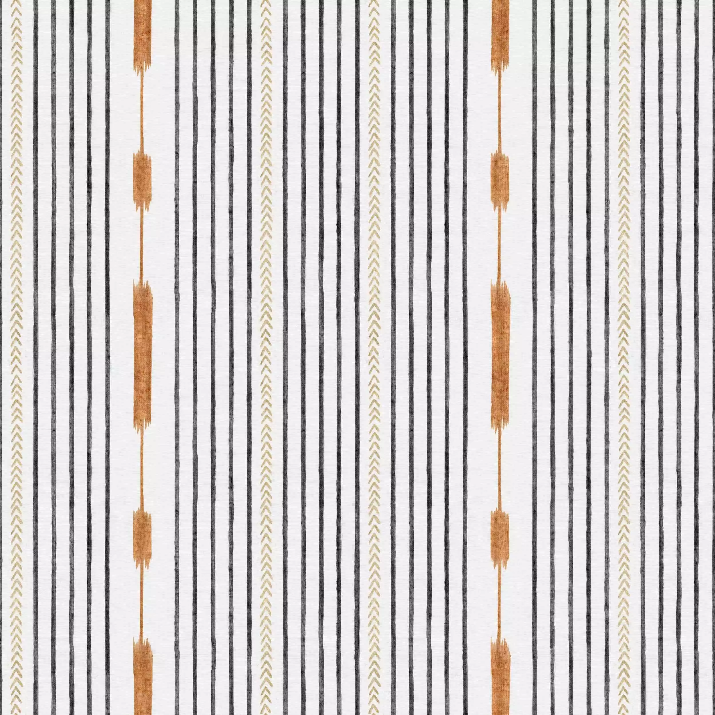 Die Tapete Huipil Black von Coordonné wurde als Streifentapete durch die bunte Kleidung indigener Frauen Mittelamerikas inspiriert. Gebrochene schwarze Streifen, abstrahiertes Fischgrät in Creme und golden gestreute Ähren zeugen von den Wurzeln der Maya-Kultur. Freundlich und hintergründig bringt dieses Design Streifen mal anders an die Wand.