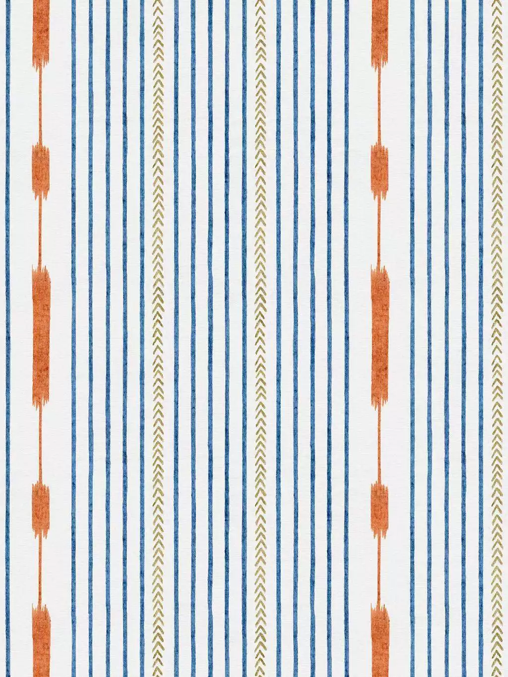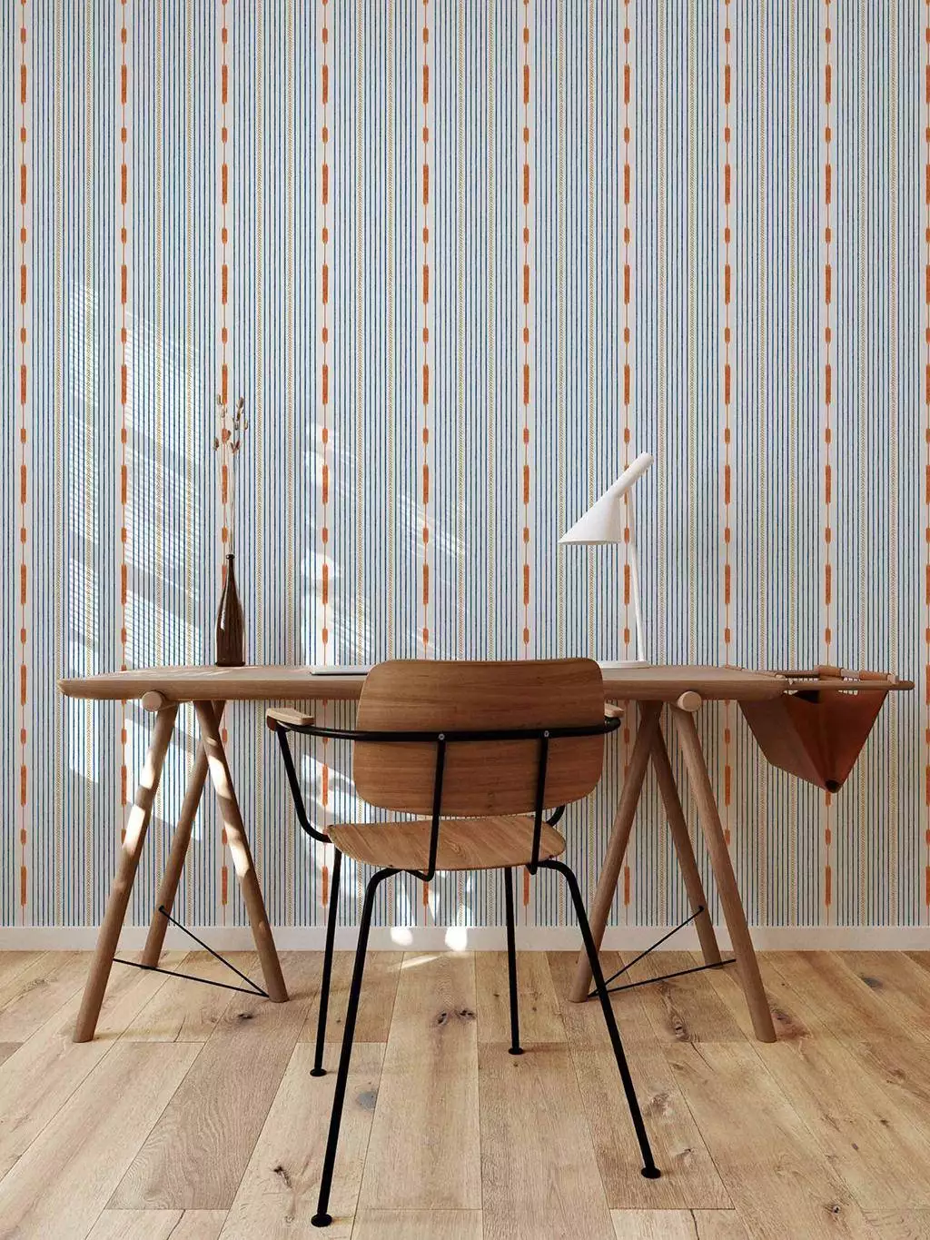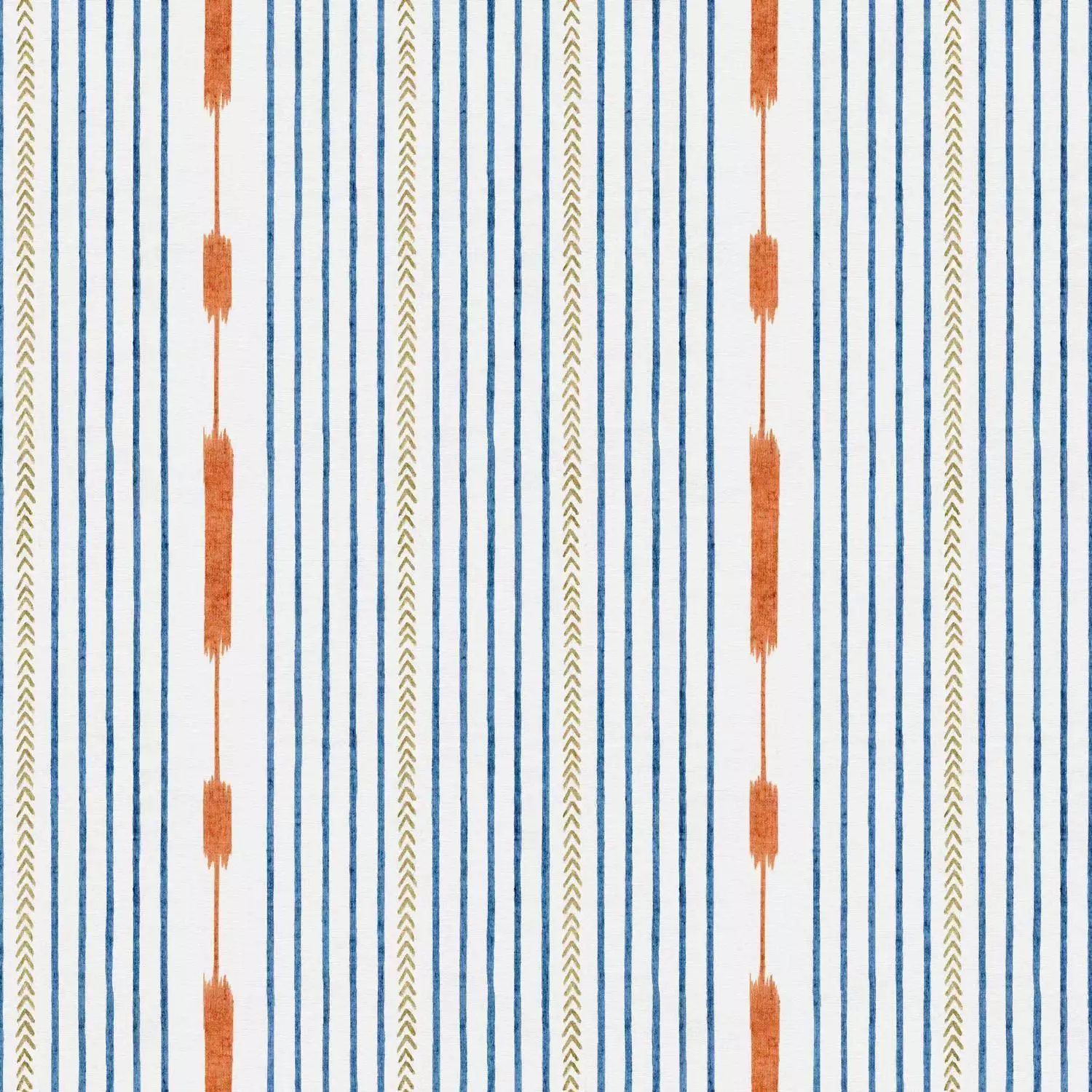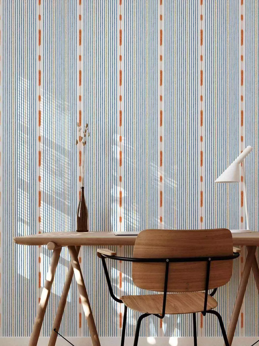 Die Streifentapete Huipil Blue von Coordonné ist durch die farbige Kleidung indigener Frauen Mittelamerikas inspiriert. Gebrochene Streifen in leuchtendem Mittelblau, abstrahiertes Fischgrät in Creme und gestreute Ähren in Orange zeugen von den Wurzeln der Maya-Kultur. Freundlich und hintergründig bringt dieses Design Streifen mal anders an die Wand.