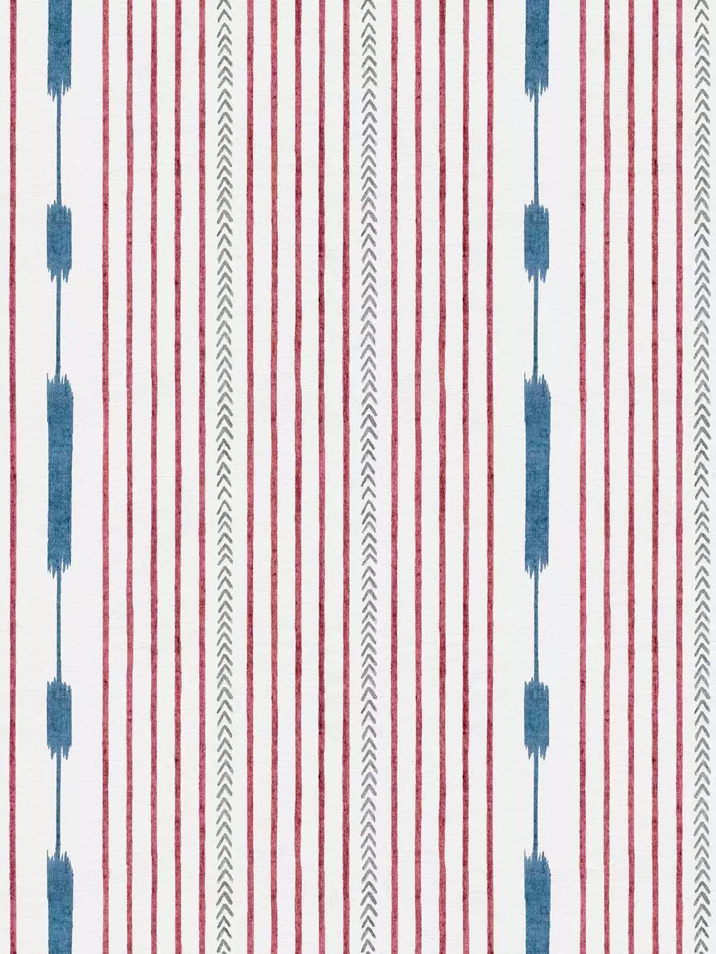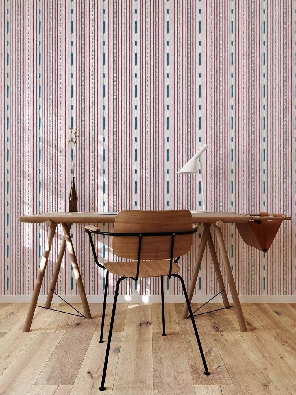 Die Streifentapete Huipil Red von Coordonné ist durch die farbige Kleidung indigener Frauen Mittelamerikas inspiriert. Gebrochene Streifen in Rot, abstrahiertes Fischgrät in Grau und gestreute Ähren in Mittelblau zeugen von den Wurzeln der Maya-Kultur. Freundlich und hintergründig bringt dieses Design Streifen mal anders an die Wand.