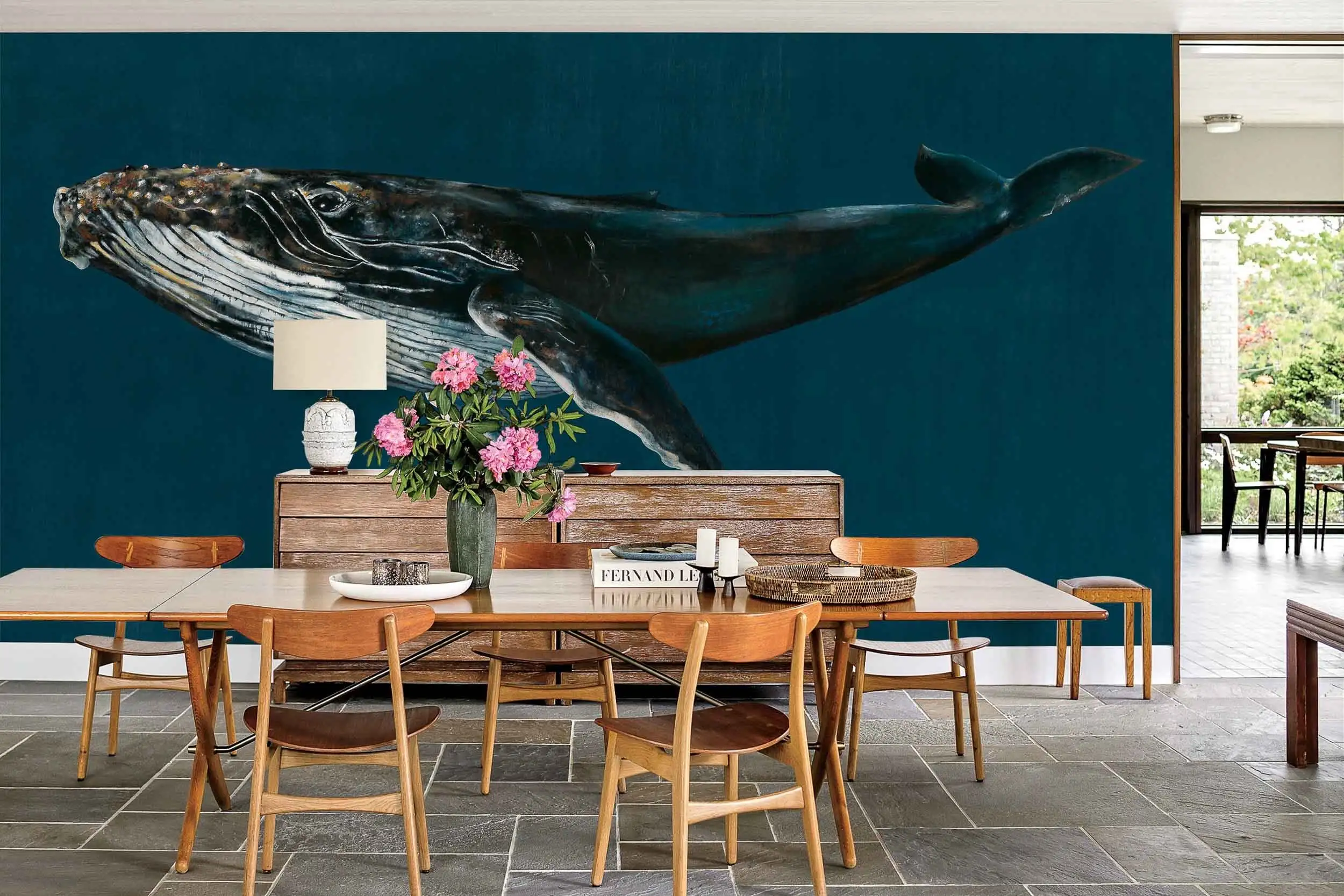 Buckelwal Ozean Wandbild in Blau-/Navy-Tönen. Diese Tapete wird für Sie auf Maß gefertigt. Teilen Sie uns Ihr Wunschmaß mit und wir erstellen Ihnen ein Angebot. Wir beraten Sie gerne!