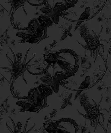 "Iguana, black on black" ist eine Tapete mit einem skurrilen Muster aus Leguanen, Vögeln und Ananassen.