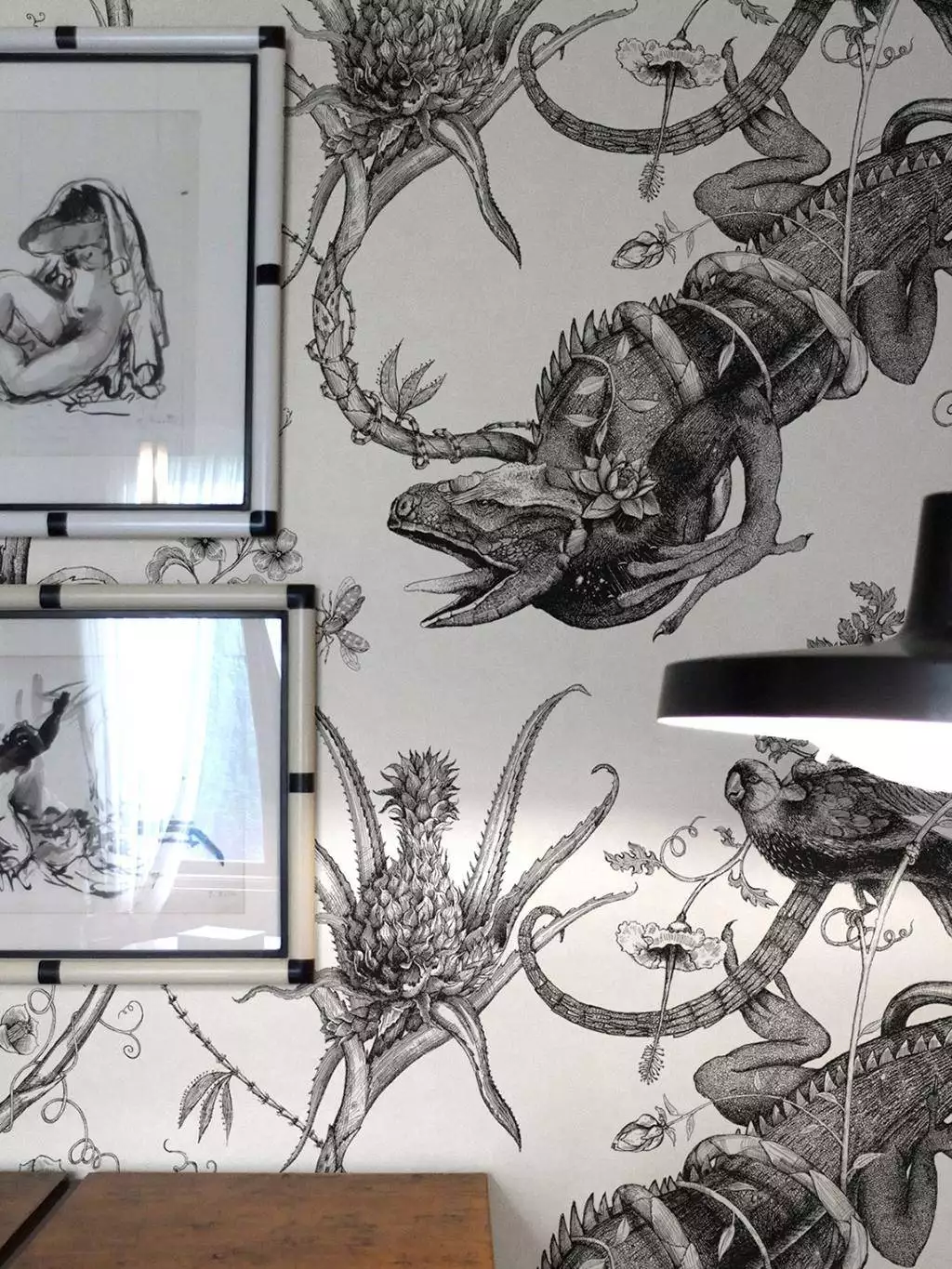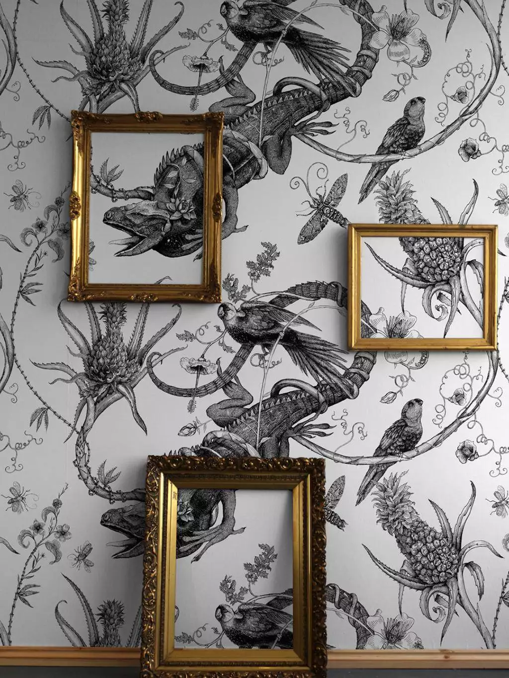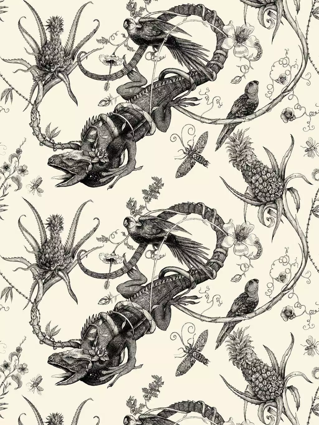 Wilderness at its best. Diese Super Wide Wallpaper von Timorous Beasties zeigt auf den ersten Blick skurrile Muster aus Leguanen, Vögeln und Ananas Fruchtkörpern. Auf den zweiten Blick erreicht den Betrachter eine Darwinistische Botschaft - der Blick auf eine seltsame und doch wunderschöne Welt voller Brutlität, in der sich die Stärksten mit all ihren Besonderheiten durchsetzen und vorherrschen. Eine wunderschöne, künstlerisch hochwertige Darstellung der Koexistenz zwischen Flora und Fauna, die man zu betrachten niemals satt wird.
