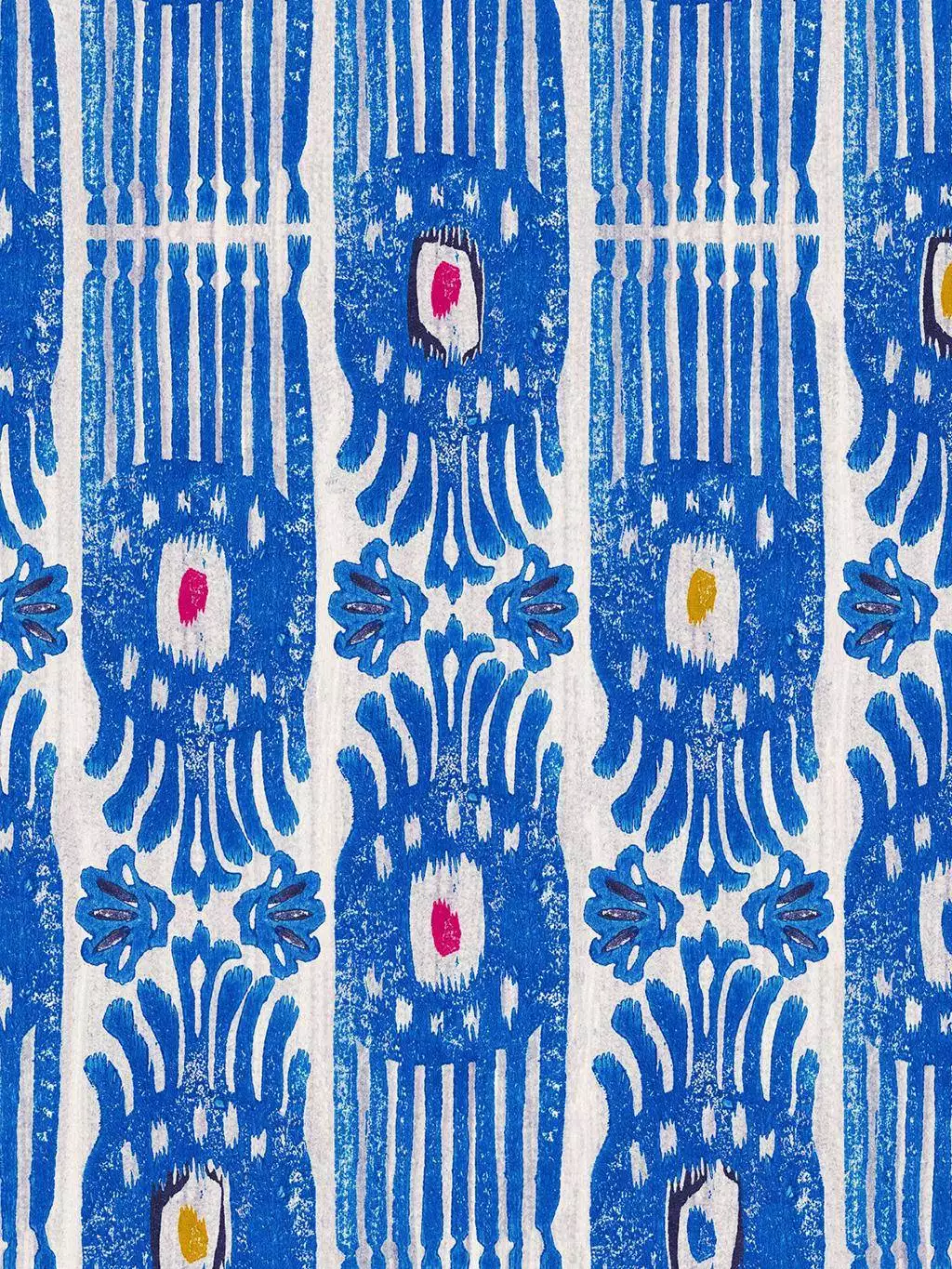 Die manuell geschnitzten Muster dieser Tapete vereinen lineare Streifen, kreisförmige Augen und florale Motive, inspiriert von den traditionellen Ikat-Mustern aus Südostasien, Südamerika und Westafrika.