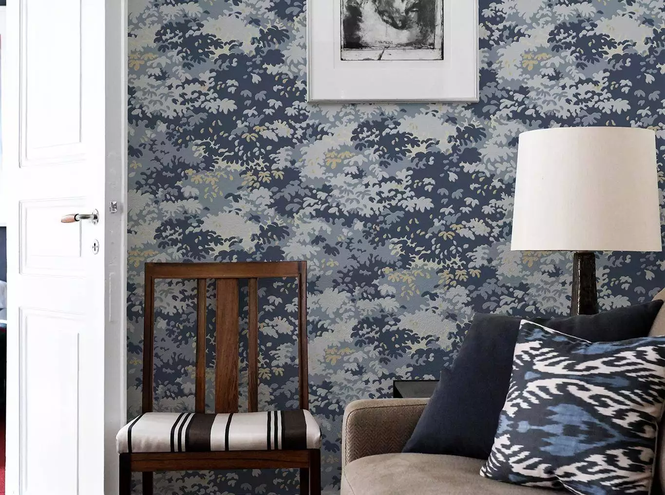 Die Tapete Into the Woods Misty Blue zeigt ein weiches, wolkenartiges Blattmuster in verschiedenen Blau- und Grautönen mit sanften Akzenten in Beige. Das harmonische Zusammenspiel der Farben erzeugt Tiefe und Bewegung, wodurch eine ruhige, fast träumerische Waldstimmung entsteht. Ideal, um Räumen eine entspannende, zugleich moderne Atmosphäre zu verleihen.