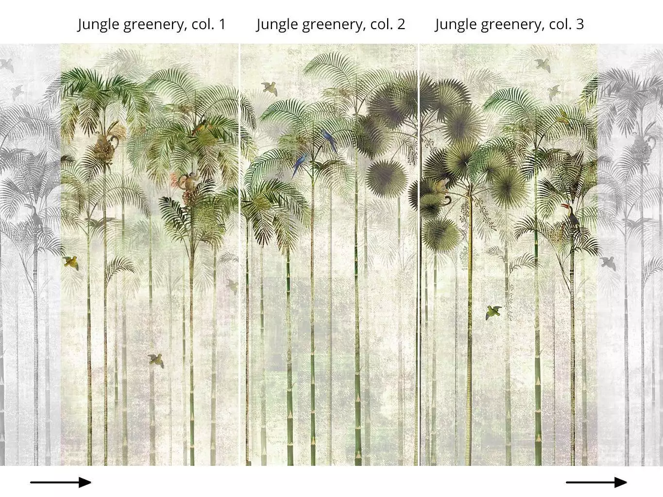 Die Tapete "Jungle greenery" erhalten Sie im Online-Shop der TapetenAgentur in insgesamt drei Variationen. Die verschiedenen Muster können in der Reihenfolge col. 1 col. 2 col. 3 fortlaufend kombiniert werden. Bestellen Sie gerne ein Muster Ihrer Wahl. Bei Fragen stehen wir Ihnen jederzeit zur Verfügung!
