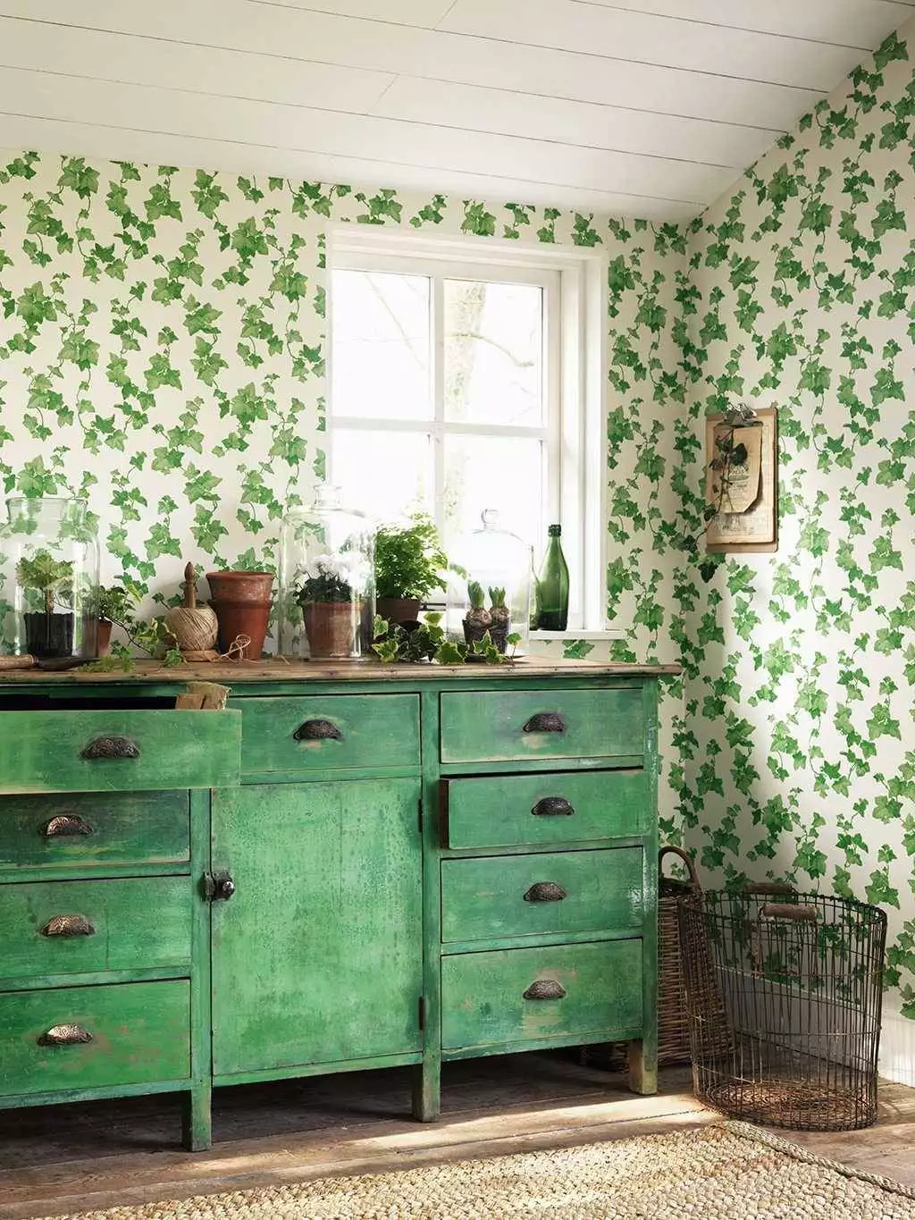 Auch wenn die Tapete mit dem filigranen Efeu-Motiv natürlich auch zu modernen Wohnlandschaften passt und sich auch hervorragend zur Kontrastierung im Industriedesign eignet, wirkt sie in einer nostalgischen Vintage-Umgebung doch am schönsten. Alte Holzkommoden, vielleicht mit einem ehemals braunen und grünen, und nun abblätterndem Anstrich, gehen eine perfekte Harmonie mit dem Efeu an der Wand ein. Oder gestalten Sie Ihre Terrasse oder eine Gartenküche mit der Tapete Käthe, die so wunderbar zu alten Kochgeschirren, gusseisernen Töpfen und Email-Deko passt.
