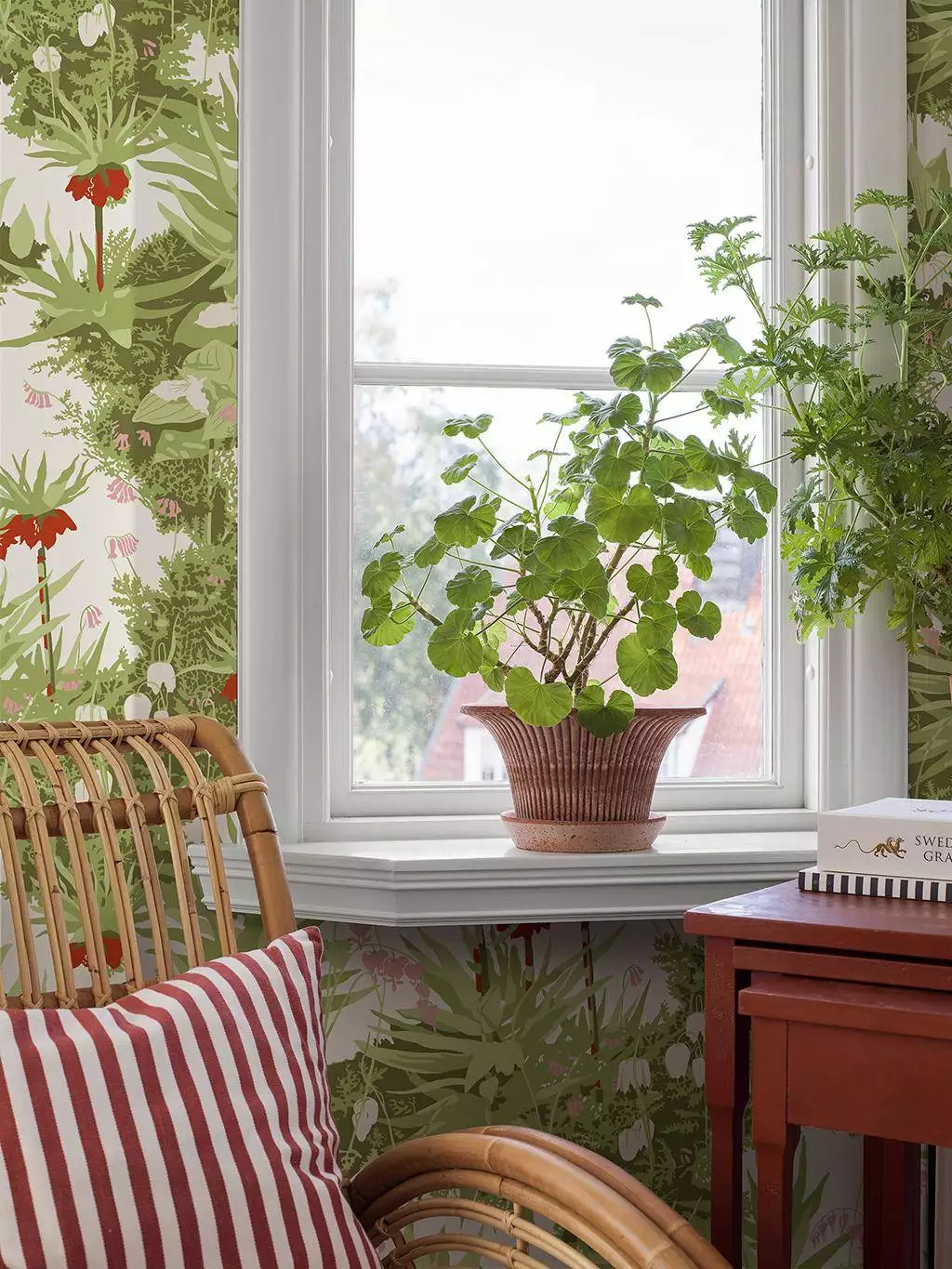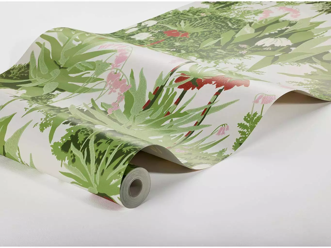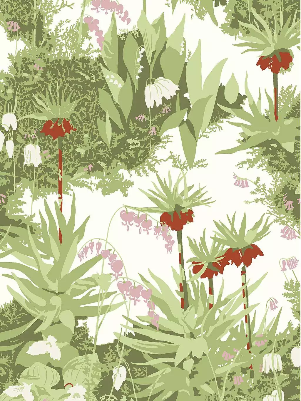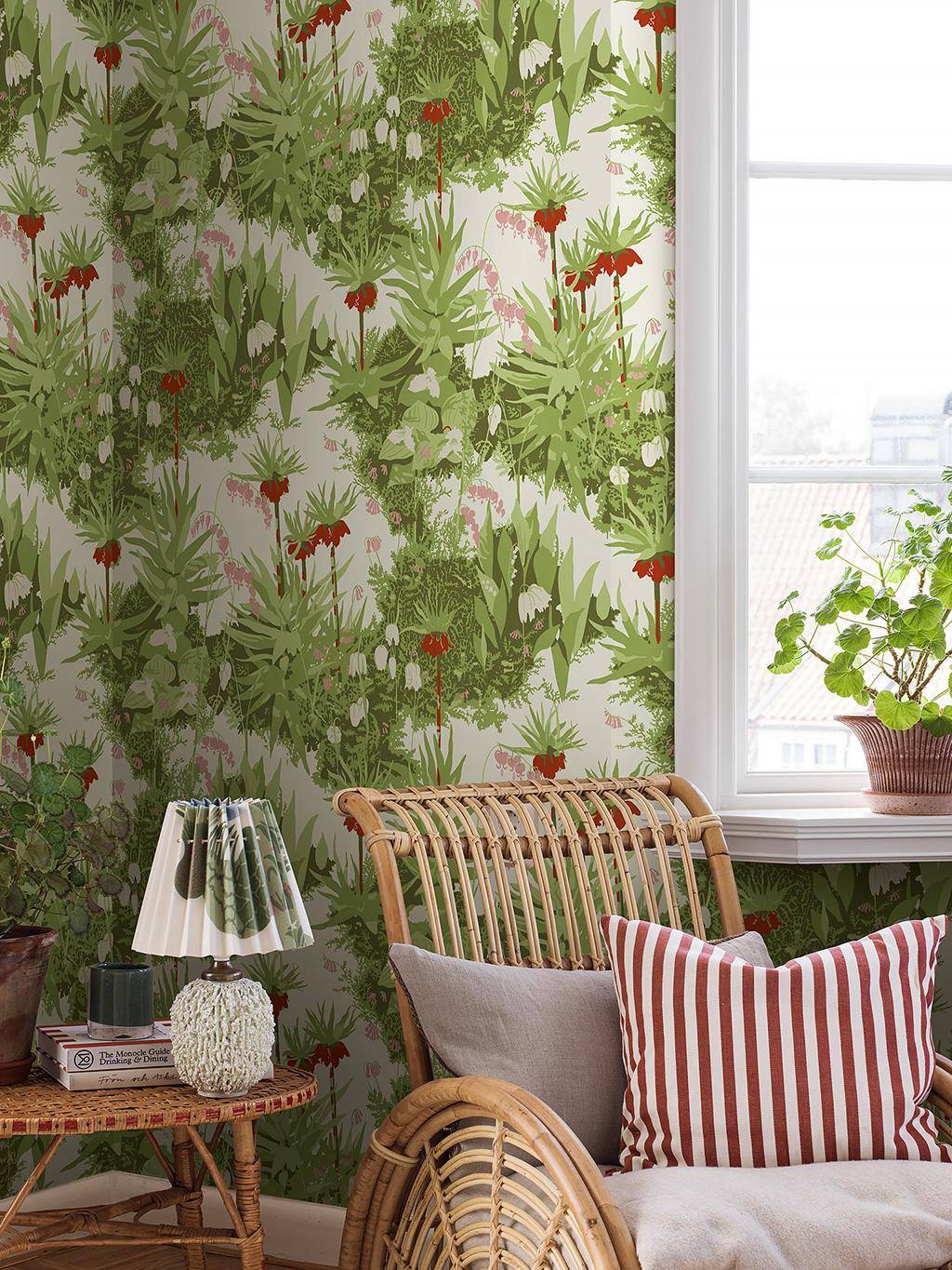 In Arne Jacobsens Tapete „Kejsarkrona“ entfaltet sich die Anmut der Kaiserkrone – jener prächtigen Frühlingsblume mit ihren tiefroten, glockenförmigen Blüten und dem grünen Schopf darüber. Zwischen zartem Blattwerk und feinen Rosatönen entsteht ein elegantes Spiel aus Form und Farbe, das zugleich organisch und klar wirkt. Ein Entwurf aus den 1950er-Jahren, der noch heute mit seiner wohnlich-eleganten Natürlichkeit beeindruckt. Aus der Kollektion Scandinavian Designers III