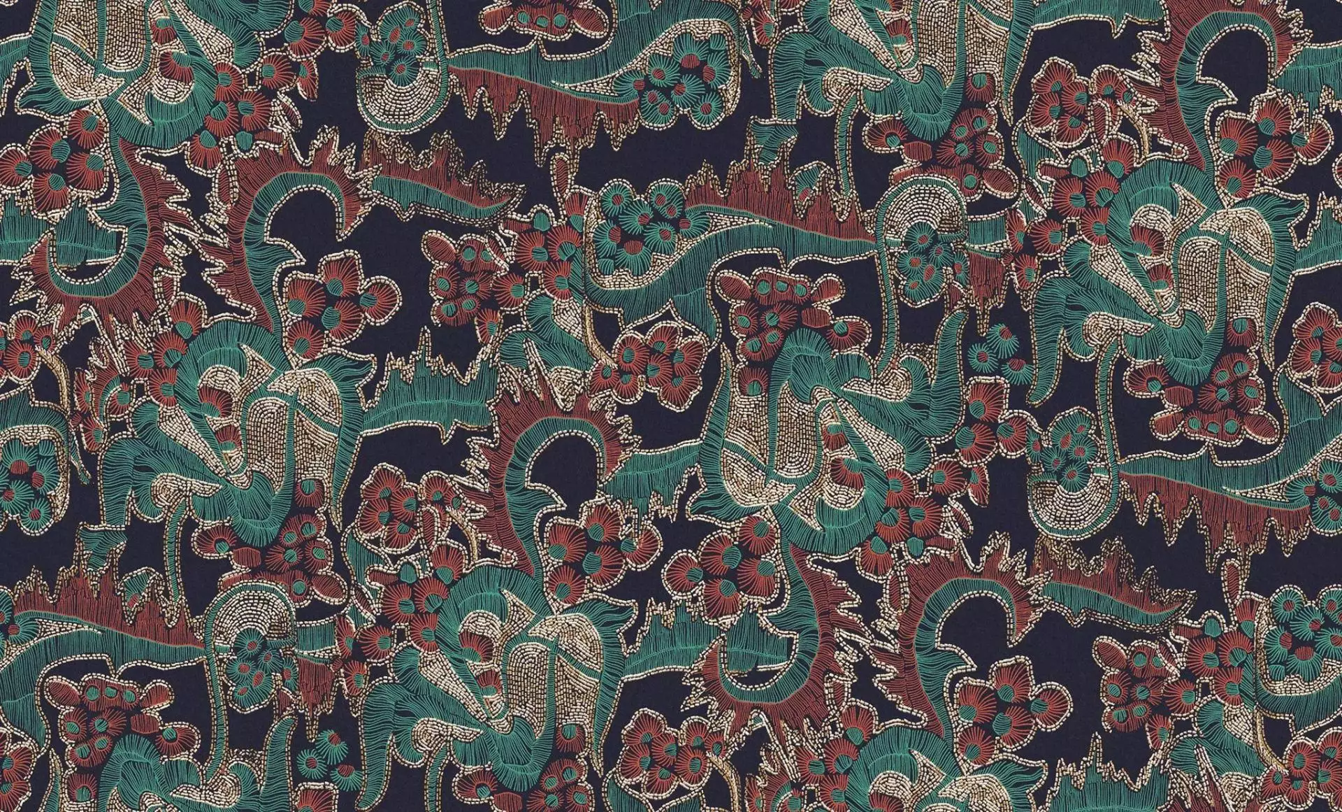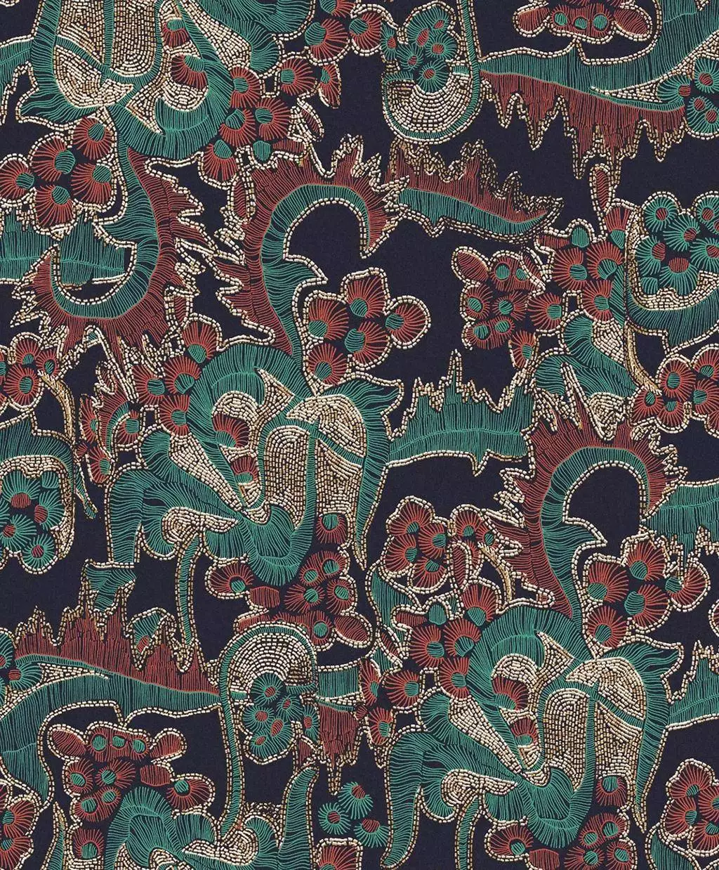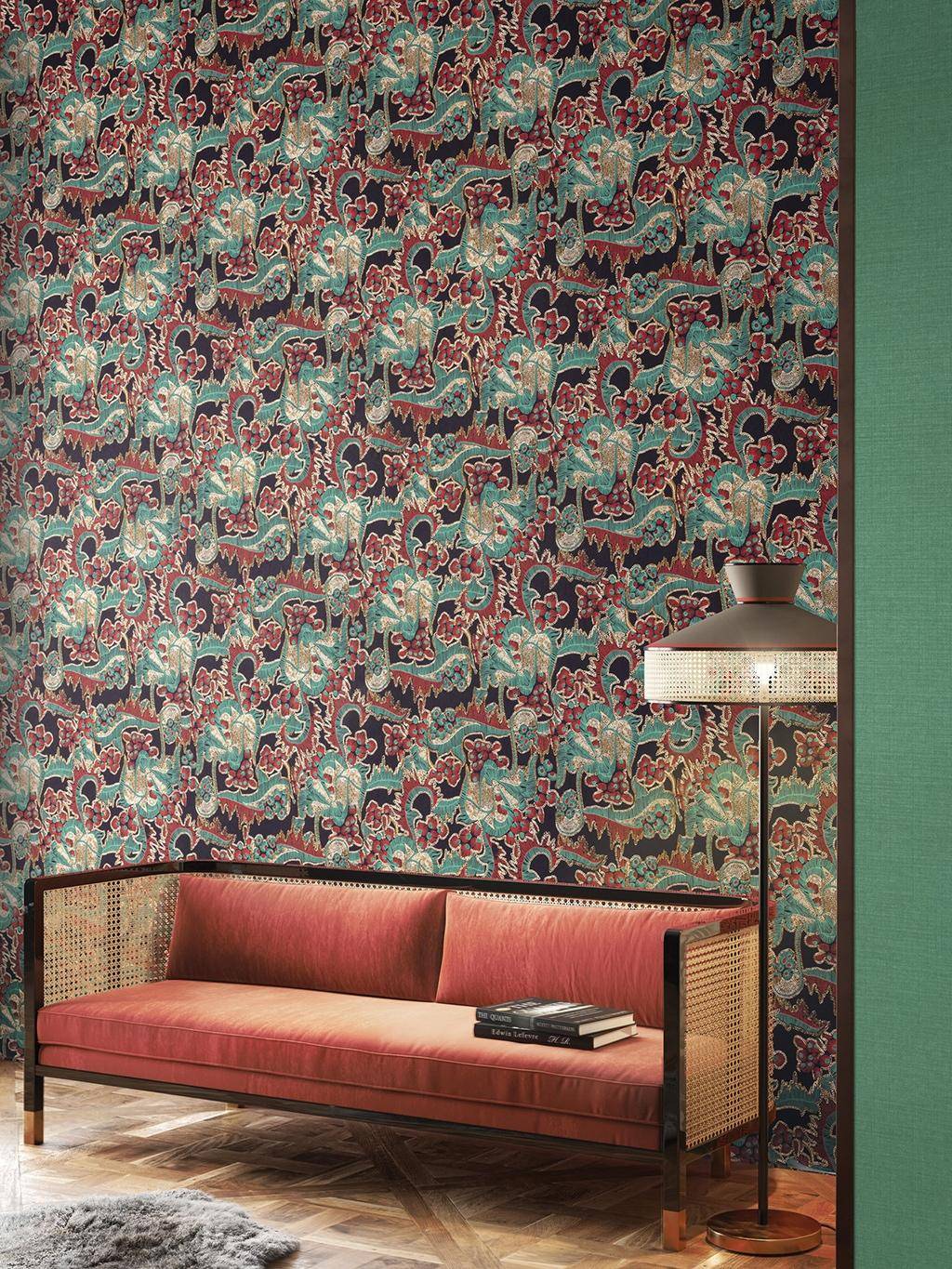 Die Tapete Kimora Topiara von Masureel aus der Kollektion Kimono verbindet geschwungene Linien mit warmen Tönen aus Gold, Rot, Grün und Braun zu abstrahierten Naturelementen. Das Design ist angelehnt an die japanische Kultur - voller Leben und Farbe. Es wirkt dynamisch und exotisch, wie ein farbenfrohes Ornament voller Bewegung. Ideal für Wohnzimmer oder Essbereich, wo es Wärme, Energie und stilvolle Lebendigkeit entfaltet.