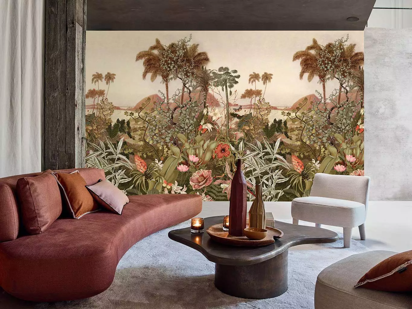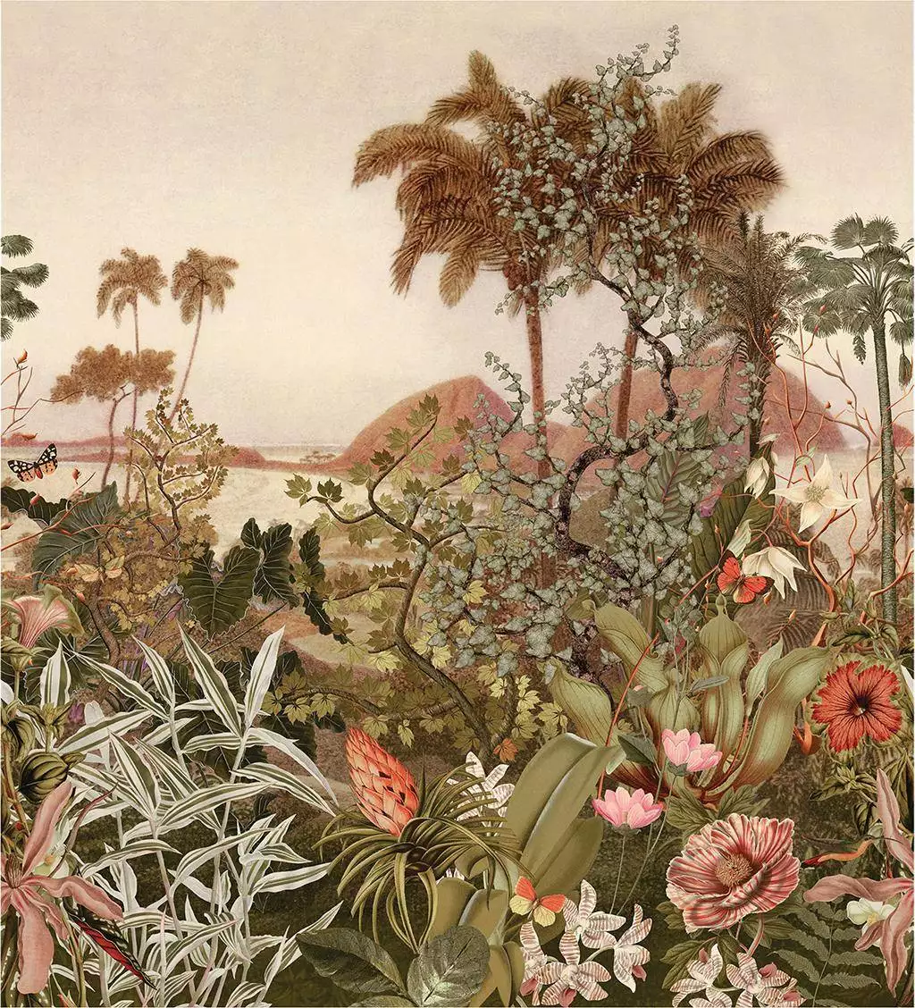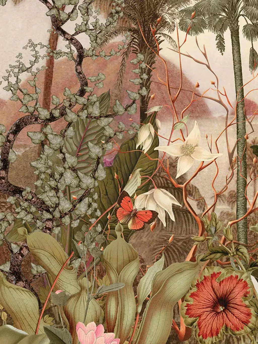 Kisama entfaltet eine detailreiche Pflanzenwelt, inspiriert vom gleichnamigen Nationalpark im Süden Angolas. Weinranken, Palmen und üppige Blüten wachsen in einem organischen Rhythmus ineinander und bilden eine vielschichtige Szenerie aus tropischer Vegetation. Zwischen Hibiskus, Orchideen und Farnen finden sich Schmetterlinge und feine Blattstrukturen – alles auf einer strukturierten Oberfläche mit natürlicher Anmutung. Die Farbgebung in warmen Erdtönen und gebrochenem Grün wirkt ruhig und ausbalanciert. Das Motiv wirkt großzügig und lebendig, ohne sich gestalterisch in den Vordergrund zu drängen.